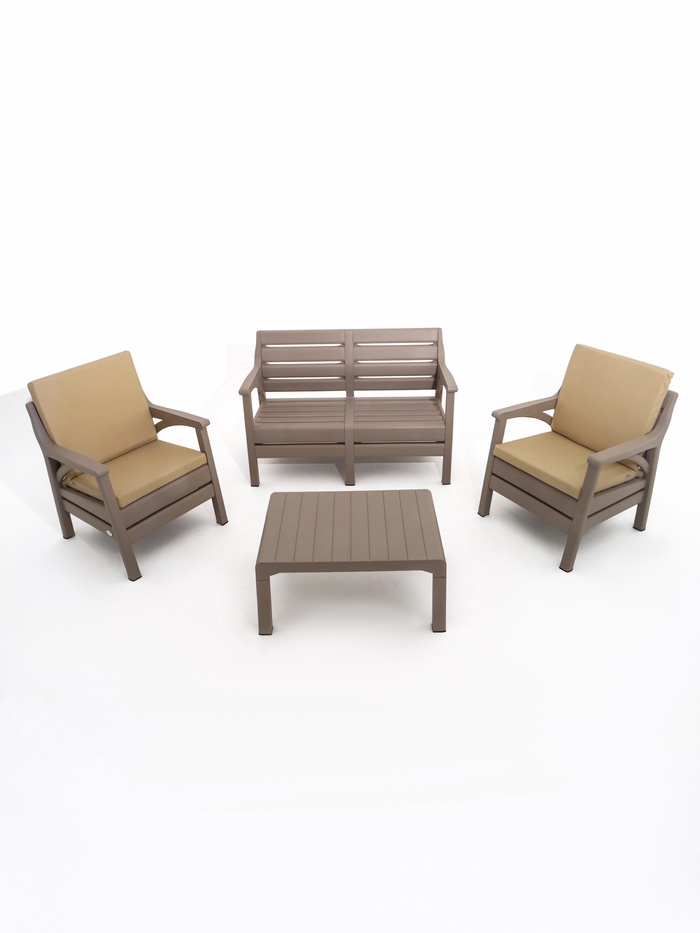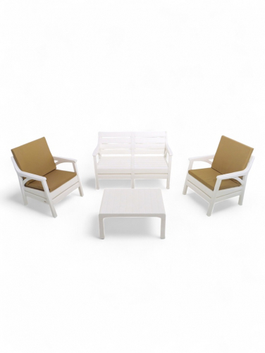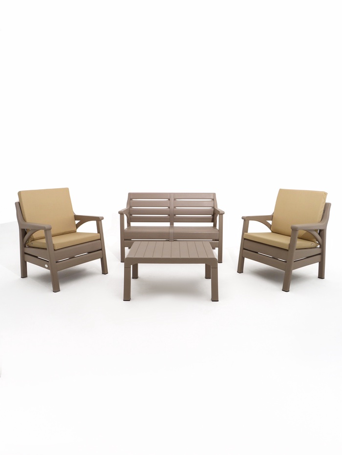 Набор садовой мебели «Евпатория» — элегантное и функциональное решение для комфортного отдыха на открытом воздухе. В комплект входят диван, два кресла и стол, выполненные из высококачественного пластика с мягкими текстильными подушками нежного бежевого оттенка. Эргономичные сиденья с подлокотниками и удобными спинками создают идеальные условия для релаксации. Просторная столешница (55×79 см) практична в использовании, а продуманные габариты всех элементов набора обеспечивают гармоничную композицию в любом пространстве.