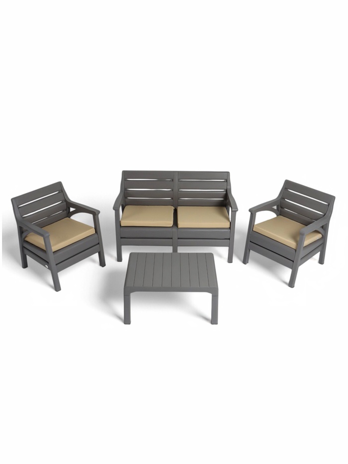 Набор садовой мебели «Евпатория» в стильном сером цвете — идеальное решение для комфортного отдыха на террасе, даче или в саду. В комплекте: просторный диван на 2 места (124×65×79 см), два удобных кресла (66×65×79 см) и практичный стол (79×55×38 см). Прочный пластиковый каркас с износостойкими текстильными подушками выдерживает значительные нагрузки: до 240 кг на диван и 120 кг на кресла. Эргономичная высота сидений (79 см) и стола (38 см) создает комфортные условия для отдыха компании до 4 человек.