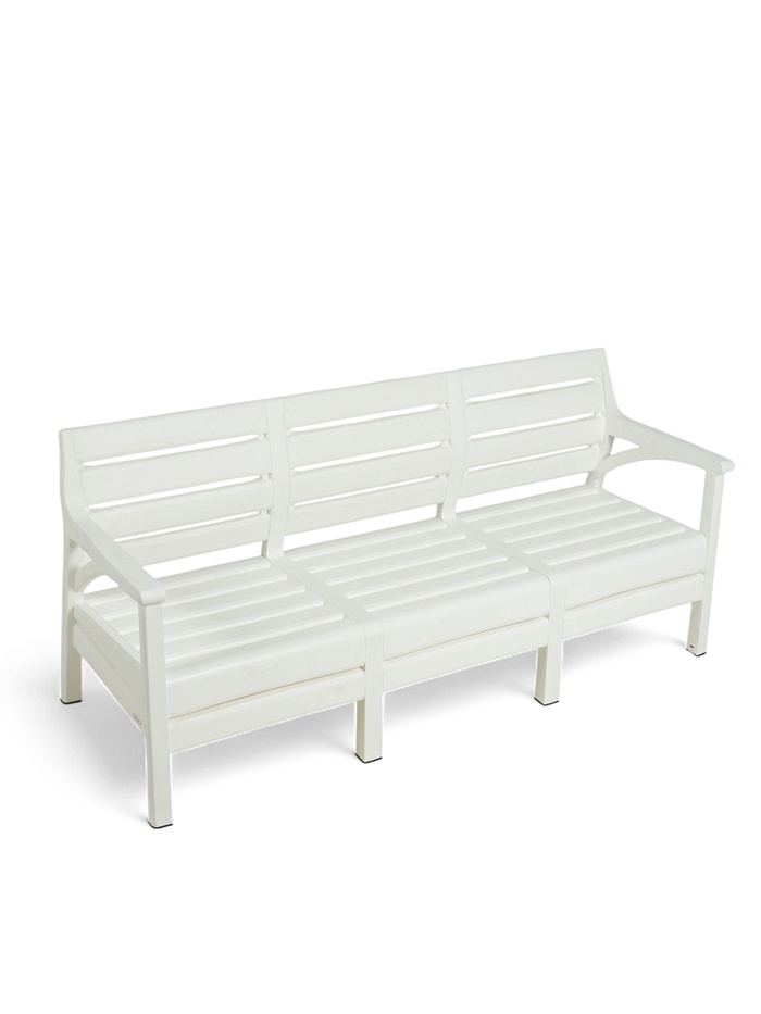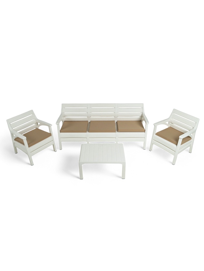 Набор садовой мебели «Евпатория» белого цвета – готовое решение для комфортного отдыха на открытом воздухе. В комплекте: диван на 3 места (190×65×79 см), 2 кресла (66×65×79 см) и стол (79×55×38 см). Ударопрочный пластик выдерживает нагрузку до 120 кг на место, а общая грузоподъемность дивана – 360 кг. Все элементы набора оснащены удобными подлокотниками.