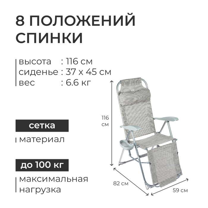 Конструкция изделия предполагает два положения на выбор: сидя и полулёжа. Вы сможете наслаждаться посиделками за столом, в кругу любимых друзей, и принимать солнечные ванны на своём участке или в любом удобном месте. Благодаря восьми положениям спинки вы настроите комфортный для вас угол наклона.