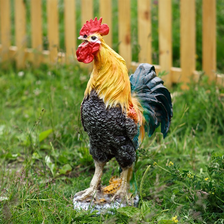 Садовая фигурка петуха - символ 2016 года. Естественная окраска делает фигурку неотличимой от настоящей птицы. Фигура для сада используется для декора участка. Материал изготовления стеклопластик - влагоустойчив, ударопрочен. Петух будет декоративным украшением вашего сада, привлекая внимание яркой естественной окраской.