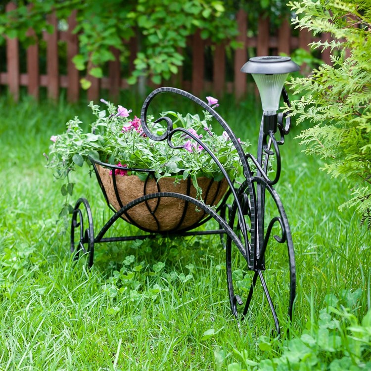 Подставка для цветов садовая с фонарем велосипед предназначена для размещения одного крупного вазона. Представляет собой грациозную и в то же время легкую конструкцию, выполненную в форме декоративного велосипеда.