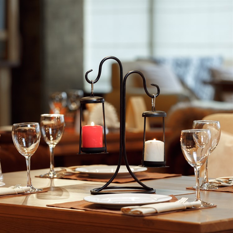 Настольный подсвечник на две свечи. Изготовлен из металла. Покраска в черный цвет. Свечи, новогодние аксессуары в комплект не входят, используются для фотосъемки.