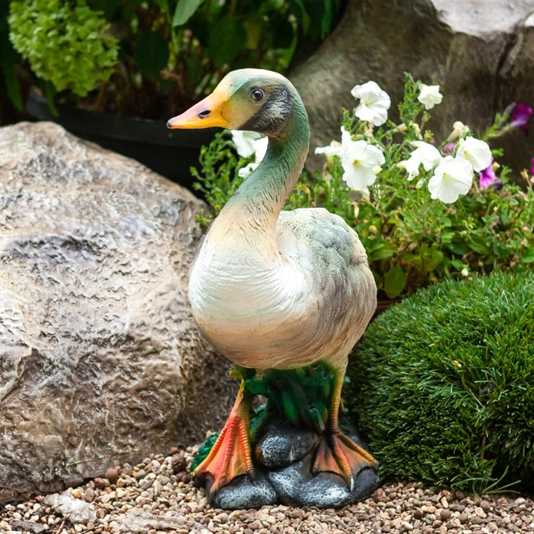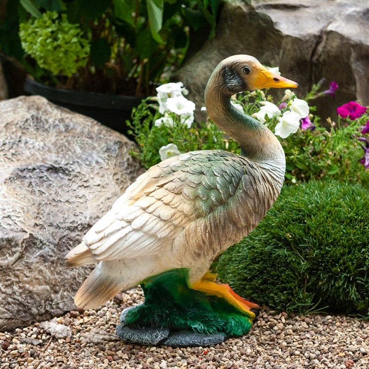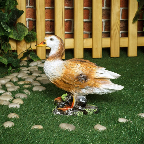 Утка в траве для украшения дачного участка. Домашняя птица утка выглядит натурально. Семейство уток создает ощущение присутствия живых птиц. Привлкают внимание своей яркой окраской и различными формами.