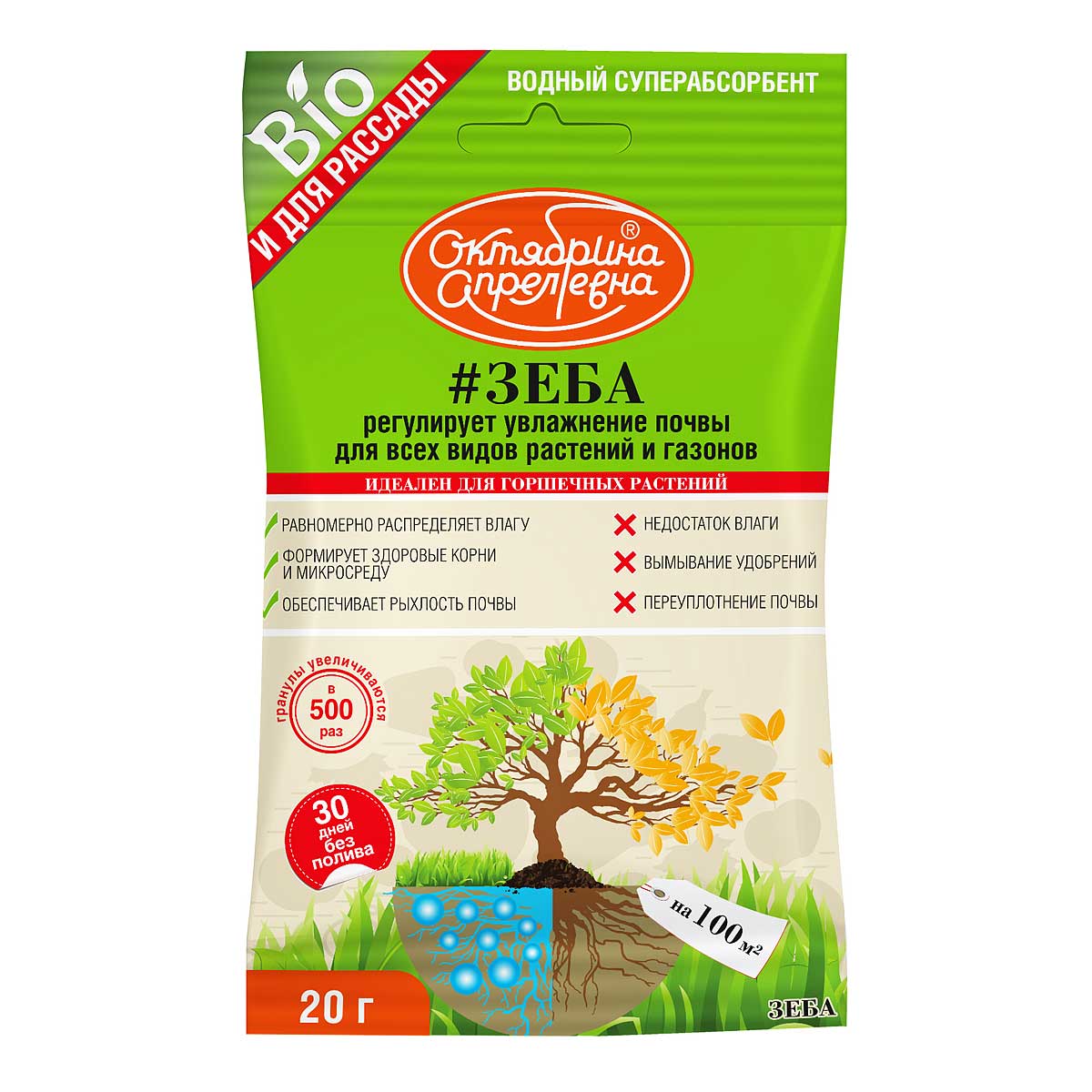 Суперэкономичный и экологичный водный суперабсорбент, который обеспечивает хорошее прорастание семян при посеве сельскохозяйственных культур. Гранулы «Зеба» увеличиваются в 500 раз, образуя гидрогели, которые высвобождают запасенную влагу и удобрения, в соответствии с потребностями растений. «Зеба» значительно увеличивает интервал между поливами, способствуя сокращению затрат на орошение и уход за растениями.