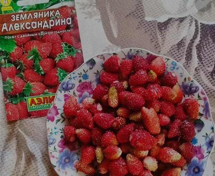 Особенностью этого сорта является крайне обильное плодоношение. Когда урожай созревает, за численностью ягод бывает сложно разглядеть листву. Александрия не просто дает хорошие урожаи, но и украшает своим привлекательным внешним видом сад, лоджии и балконы. Плоды этого сорта небольшие, удлиненной формы конуса, заостренные к концу. Масса плода 7-8 г. Ягоды сочно-красного цвета, гладкая блестящая поверхность. Мякоть ароматная, свежая, сладкая, с ярко выраженным земляничным привкусом.