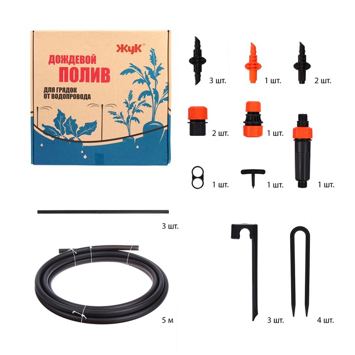 Набор дождевого полива«Жук» на одну грядку — это система верхнего полива, которая имитирует естественный дождь. Комплект подключается к водопроводному крану и создаёт мелкодисперсную водяную завесу над растениями.