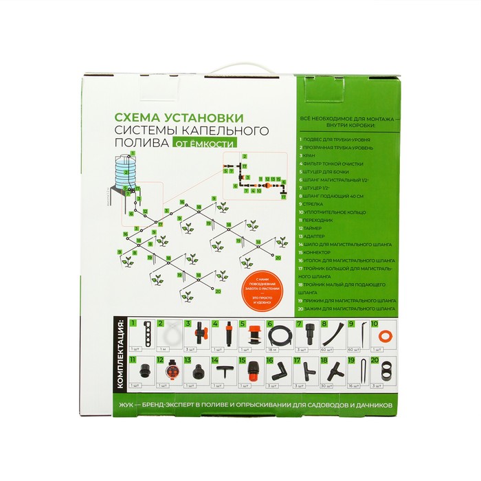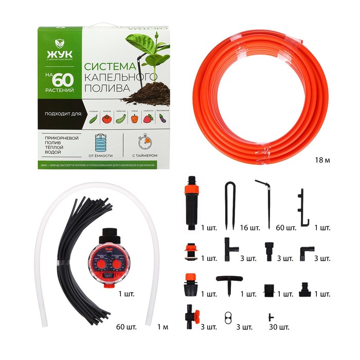 Набор рассчитан на орошение 60 растений (2 грядки длиной 6 м).