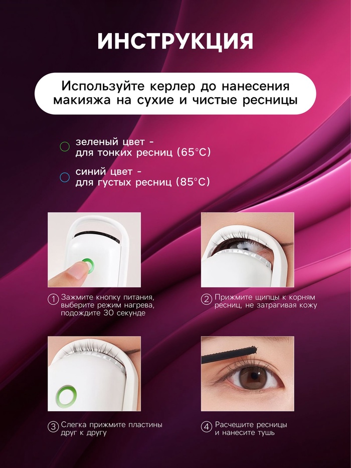 Этот электрический керлер для ресниц станет вашим незаменимым помощником в создании выразительного взгляда. Благодаря своей простоте и эффективности, устройство позволяет быстро и легко подкрутить ресницы, придавая им красивый изгиб.
