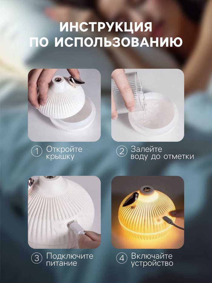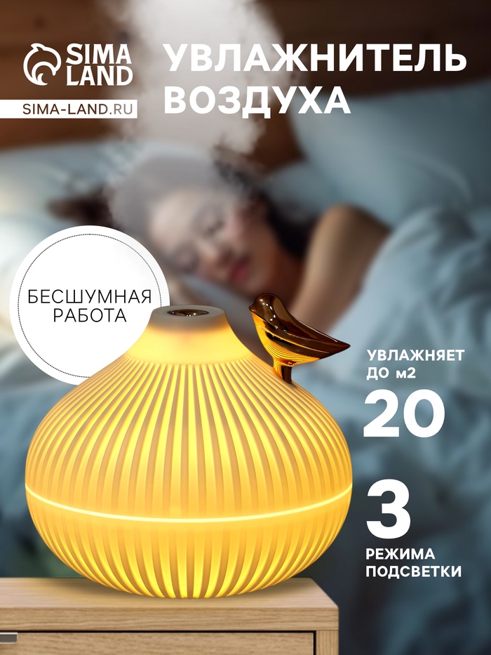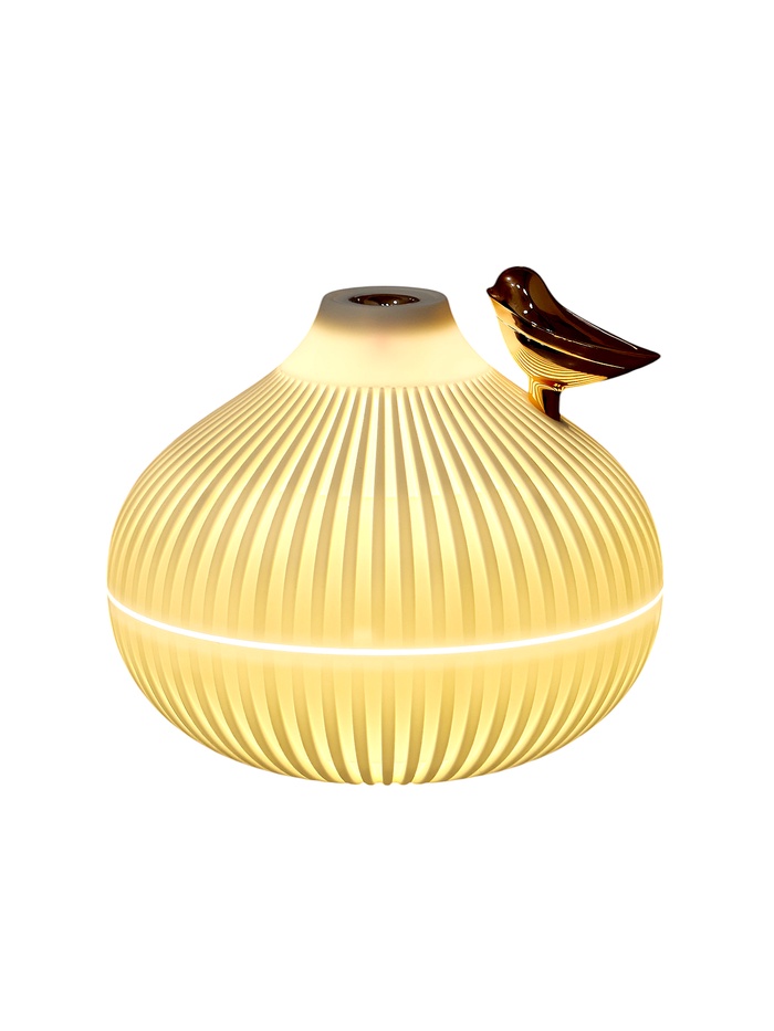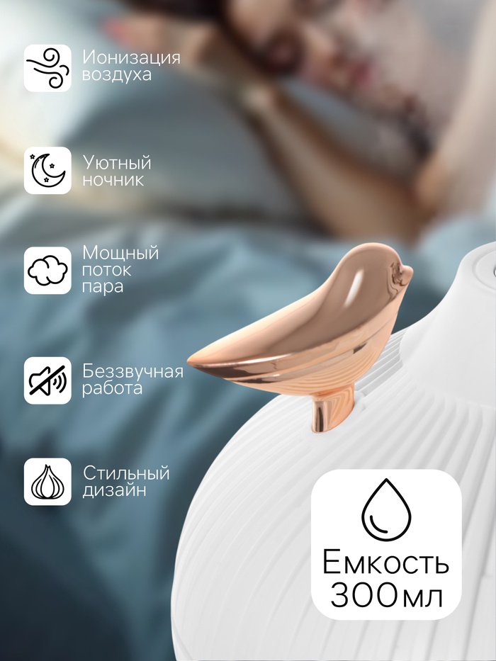 * Компактный и стильный дизайн: Белый корпус, деталь в виде птички и небольшие размеры позволяют устройству органично вписаться в любой интерьер. Увлажнитель легко разместить на столе или тумбочке.