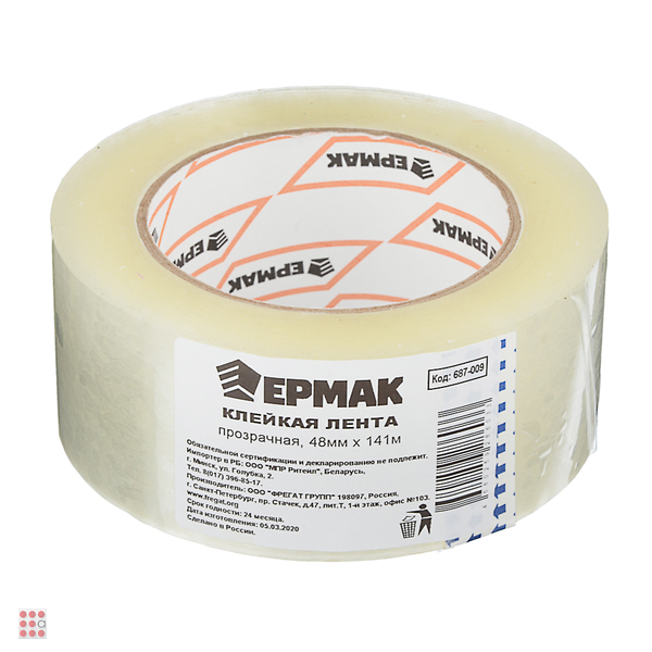 Скотч для упаковки представляет полипропиленовую пленку, основа которой пропитана клейким составом. Пленка обладает хорошей прочностью, акриловая основа клейкого состава имеет свойства морозостойкости. Благодаря таким качествам скотчем удобно запечатывать, надежно упаковать и хранить любую тару при отрицательных температурах, высокопроцентной влажности. Упаковочный скотч нашел применение в различных, отраслях это один из самых распространенных упаковочных материалов. ЕРМАК Клейкая лента прозрачная 48мм x 141м