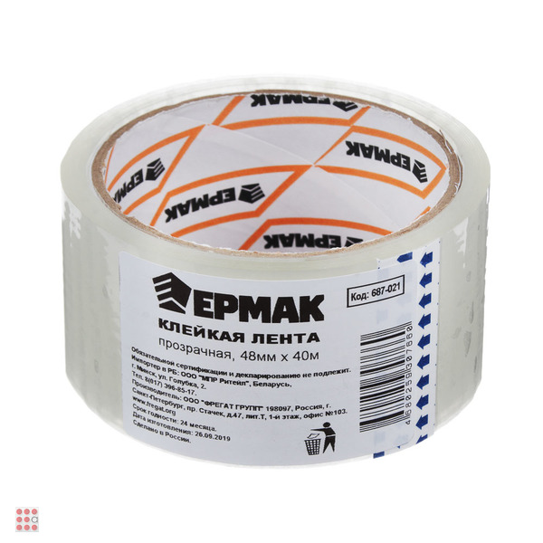 Скотч для упаковки представляет полипропиленовую пленку, основа которой пропитана клейким составом. Пленка обладает хорошей прочностью, акриловая основа клейкого состава имеет свойства морозостойкости. Благодаря таким качествам скотчем удобно запечатывать, надежно упаковать и хранить любую тару при отрицательных температурах, высокопроцентной влажности. Упаковочный скотч нашел применение в различных, отраслях это один из самых распространенных упаковочных материалов. ЕРМАК Клейкая лента прозрачная 48мм x 40м