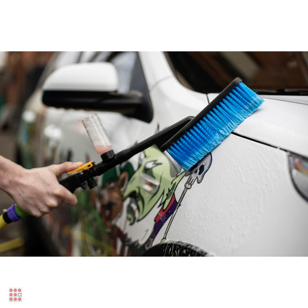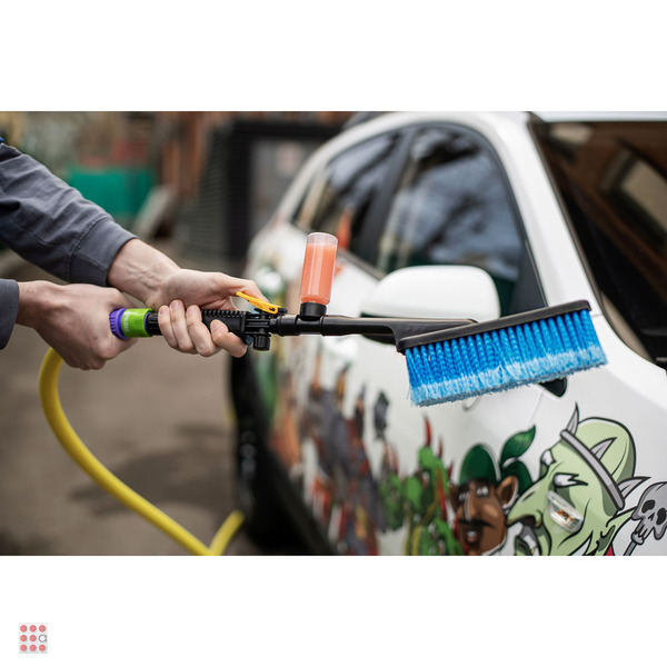 Щётка-мойка с подачей воды и моющего средства (шампунь, очиститель и др.) предназначена для мытья любых поверхностей (автомобили, пол, стены, стекла). Мягкая щетина не повреждает покрытие автомобиля. Также можно использовать для мытья фасадов, окон с внешней стороны здания, полов, стен и других водостойких поверхностей. •    Возможность смешивать моющее средство с водой непосредственно при подаче воды. •    Подключение к шлангу. •    Благодаря мягкой щетине с расщепленными концами, щётка прекрасно отмывает поверхность, не повреждая ее. •    На время хранения можно полностью разобрать щетку. Щетка для мытья автомобиля, 53x8см, с распылителем, пластик