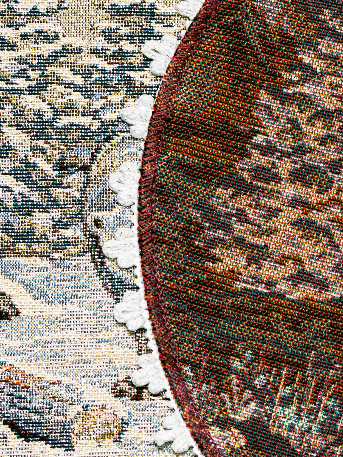 Рисунок создается переплетением нитей различных цветов и фактуры. Состав ткани: хлопок ( дающий фактуру и приятную тактильность ) и синтетические нити ( придающие износостойкость ). Плотность гобелена 410 г на кв.метр.