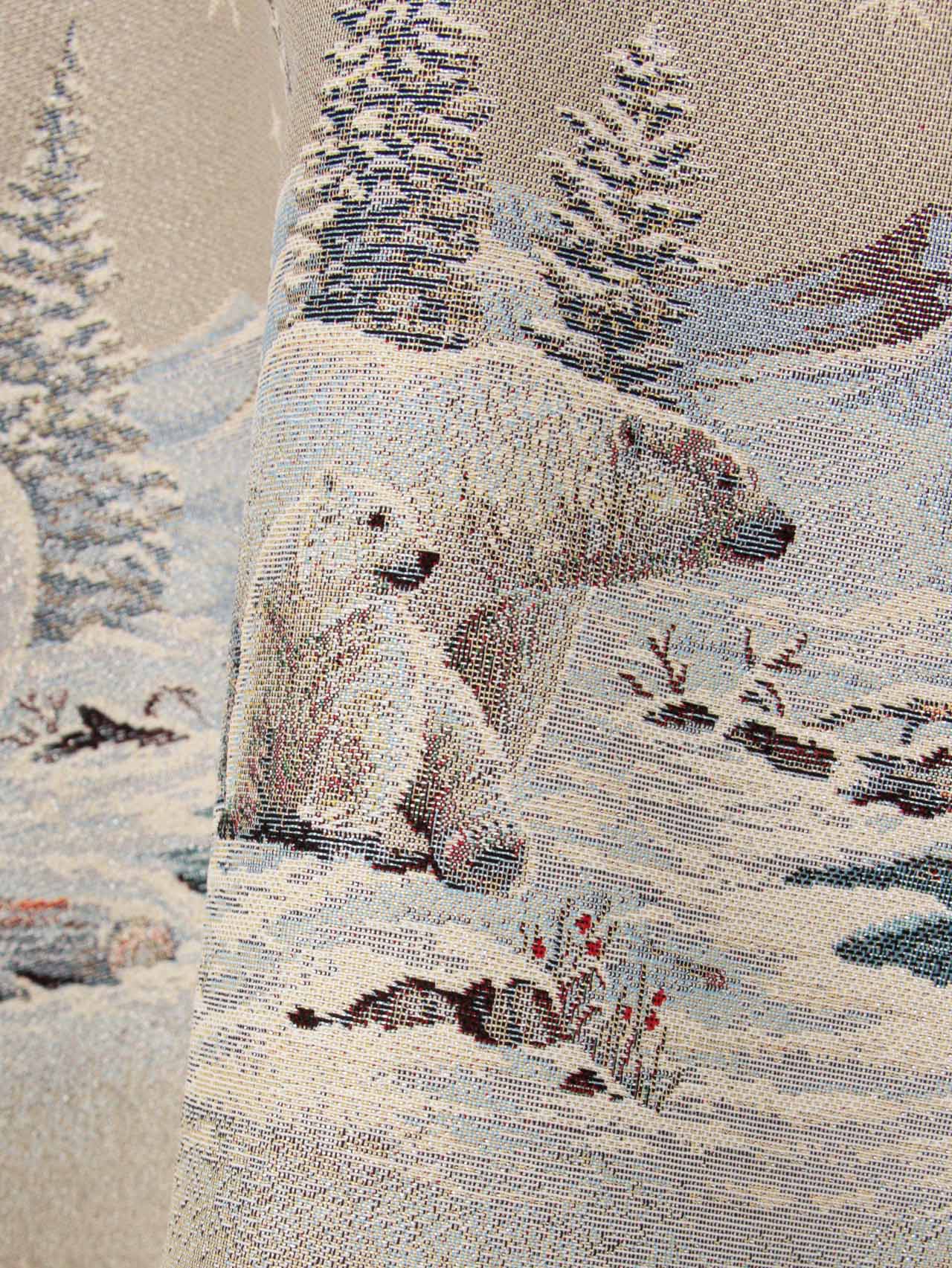 Рисунок создается переплетением нитей различных цветов и фактуры. Состав ткани: хлопок ( дающий фактуру и приятную тактильность ) и синтетические нити ( придающие износостойкость ). Плотность гобелена 410 г на кв.метр.