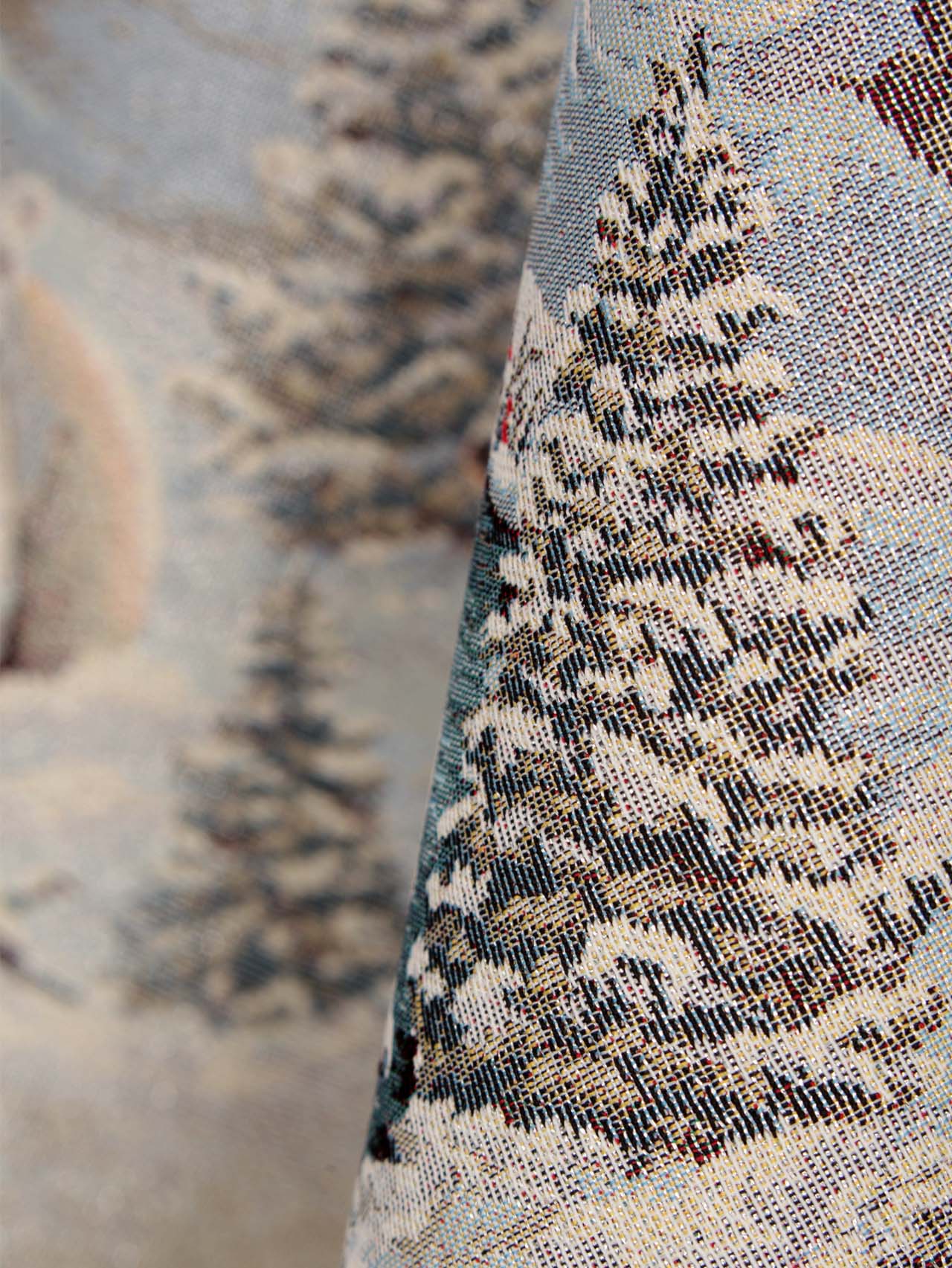 Рисунок создается переплетением нитей различных цветов и фактуры. Состав ткани: хлопок ( дающий фактуру и приятную тактильность ) и синтетические нити ( придающие износостойкость ). Плотность гобелена 410 г на кв.метр.