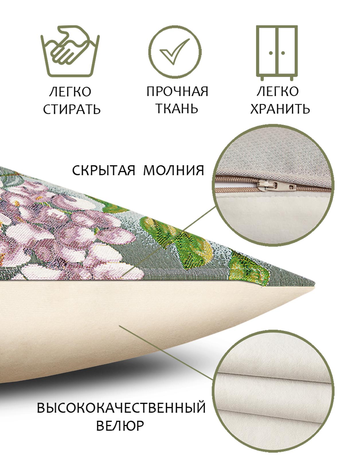 Рисунок создается переплетением нитей различных цветов и фактуры. Состав ткани: хлопок ( дающий фактуру и приятную тактильность ) и синтетические нити ( придающие износостойкость ). Плотность гобелена 410 г на кв.метр.