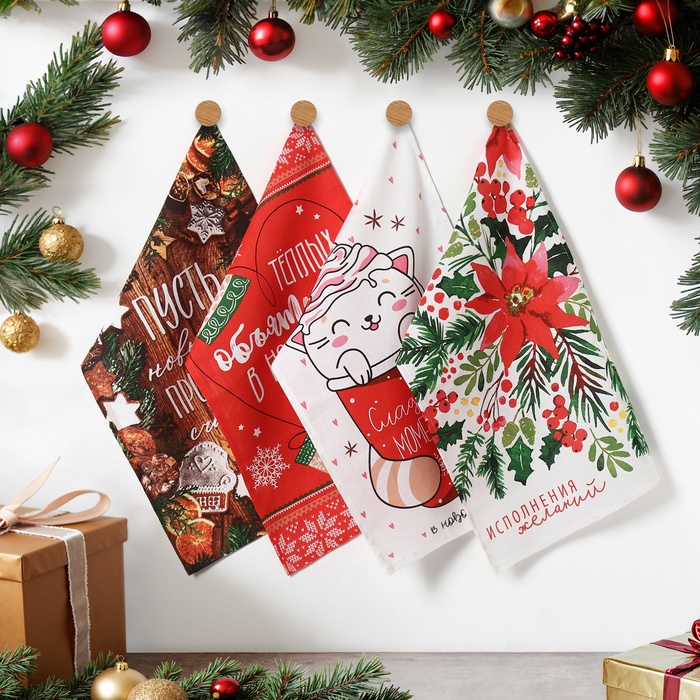 Набор новогодних кухонных полотенец Доляна «Новогоднее настроение» 35×60 см-4 штуки, 100% хлопок
