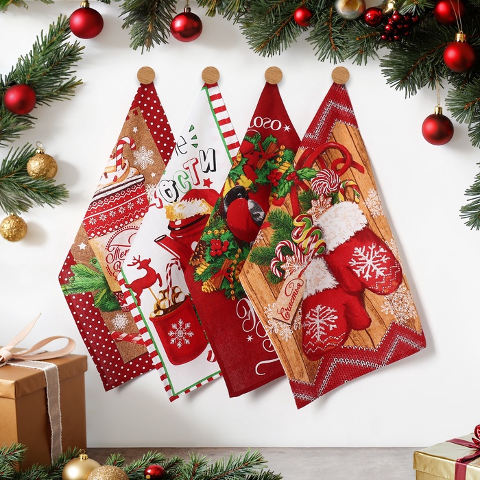 Набор новогодних кухонных полотенец Доляна «Сказочного Нового года» 35×60 см-4 штуки, 100% хлопок