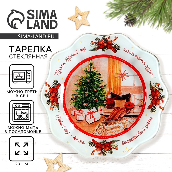 Новогодняя стеклянная тарелка размером 23 см — идеальный выбор для сервировки стола.