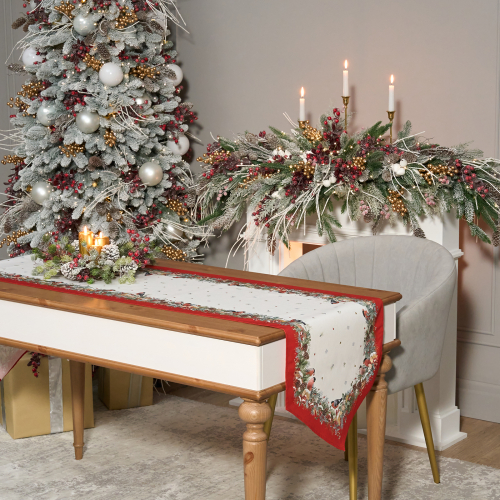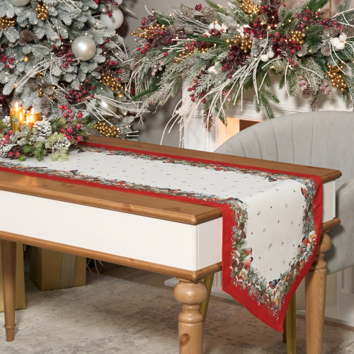 Хорошо комбинируется с однотонными скатертями, посудой в классическом или прованском стиле, текстилем в зимней палитре. Подходит для дома, дачи, загородного коттеджа. Размер 45×300 см идеально подойдёт для прямоугольных и овальных столов, позволяя создать аккуратный и завершённый образ сервировки.