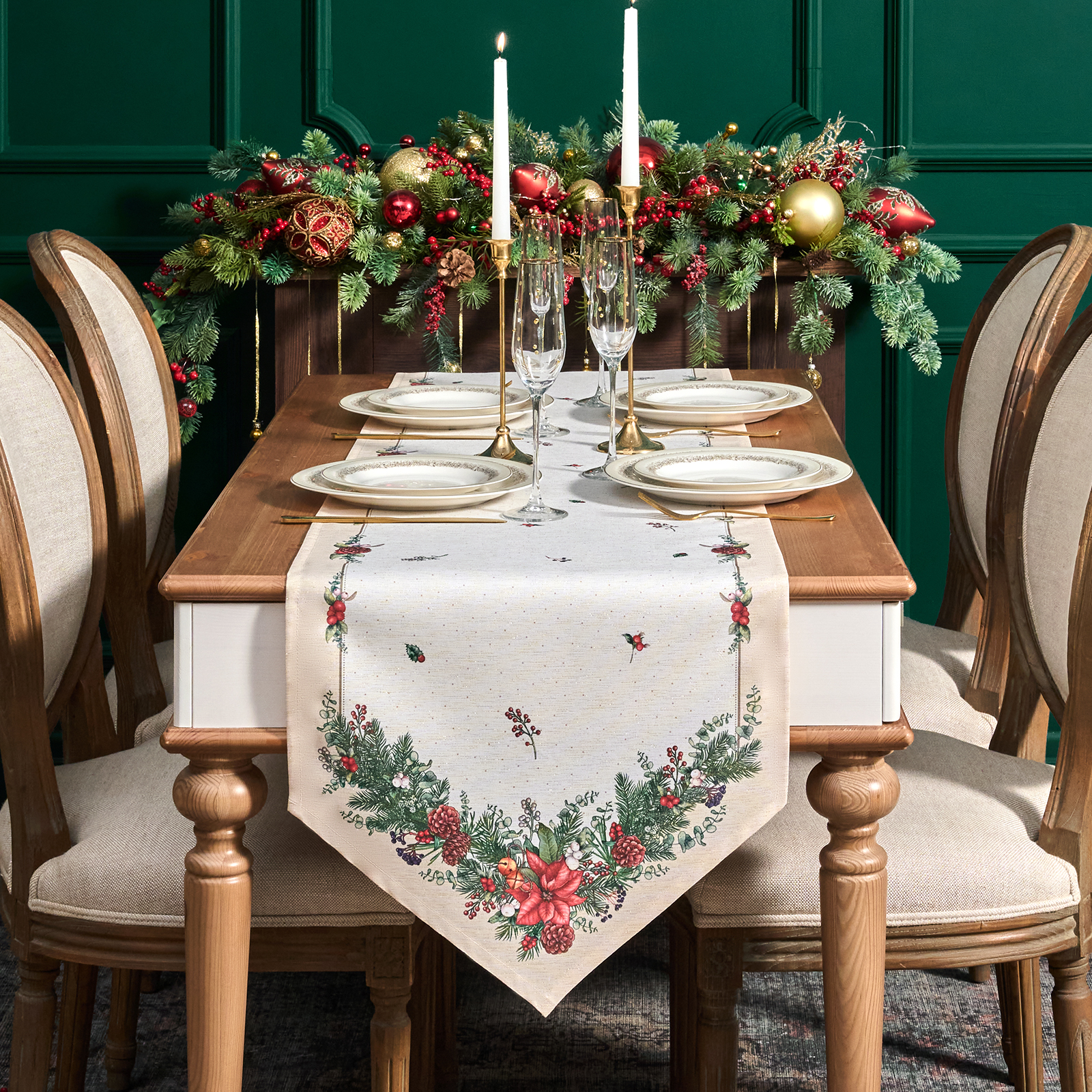 Хорошо комбинируется с однотонными скатертями, посудой в классическом или прованском стиле, текстилем в зимней палитре. Подходит для дома, дачи, загородного коттеджа. Размер 45×145 см идеально подойдёт для прямоугольных и овальных столов, позволяя создать аккуратный и завершённый образ сервировки.