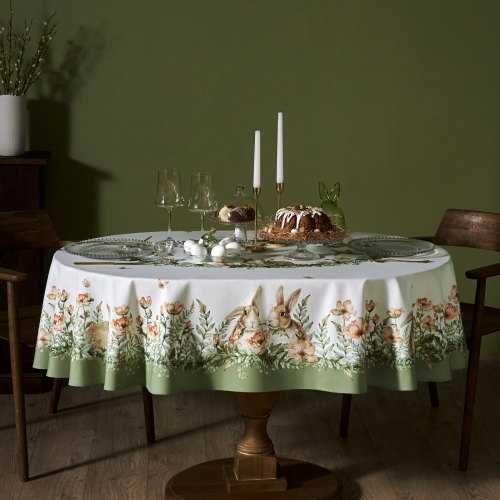 Принт с милыми кроликами, нежными зелёными оттенками и природными мотивами делает изделие выразительным элементом декора, благодаря которому стол становится центром внимания. Дорожка создаёт атмосферу уюта и гармонии на кухне, в столовой, гостиной или на даче.
