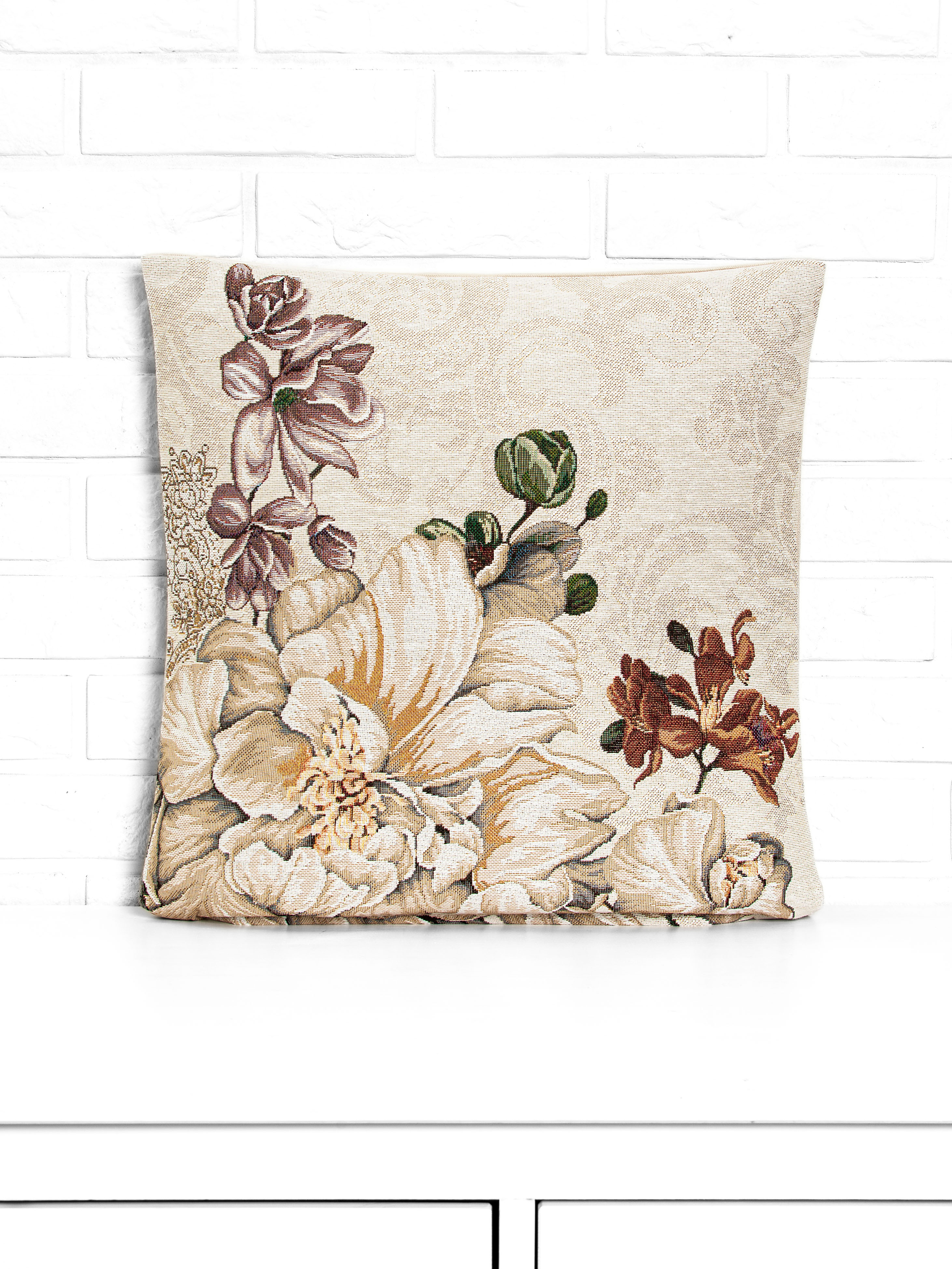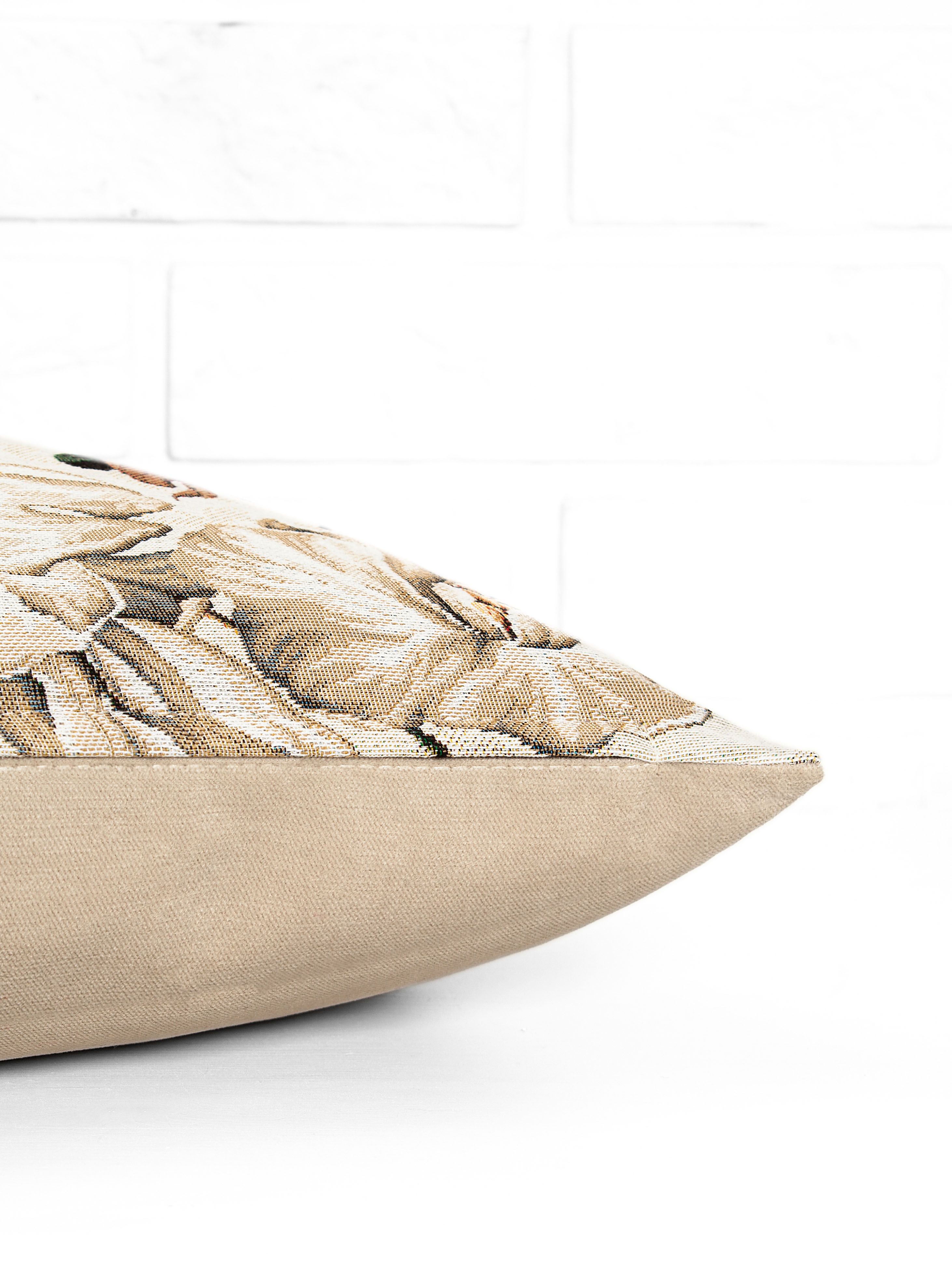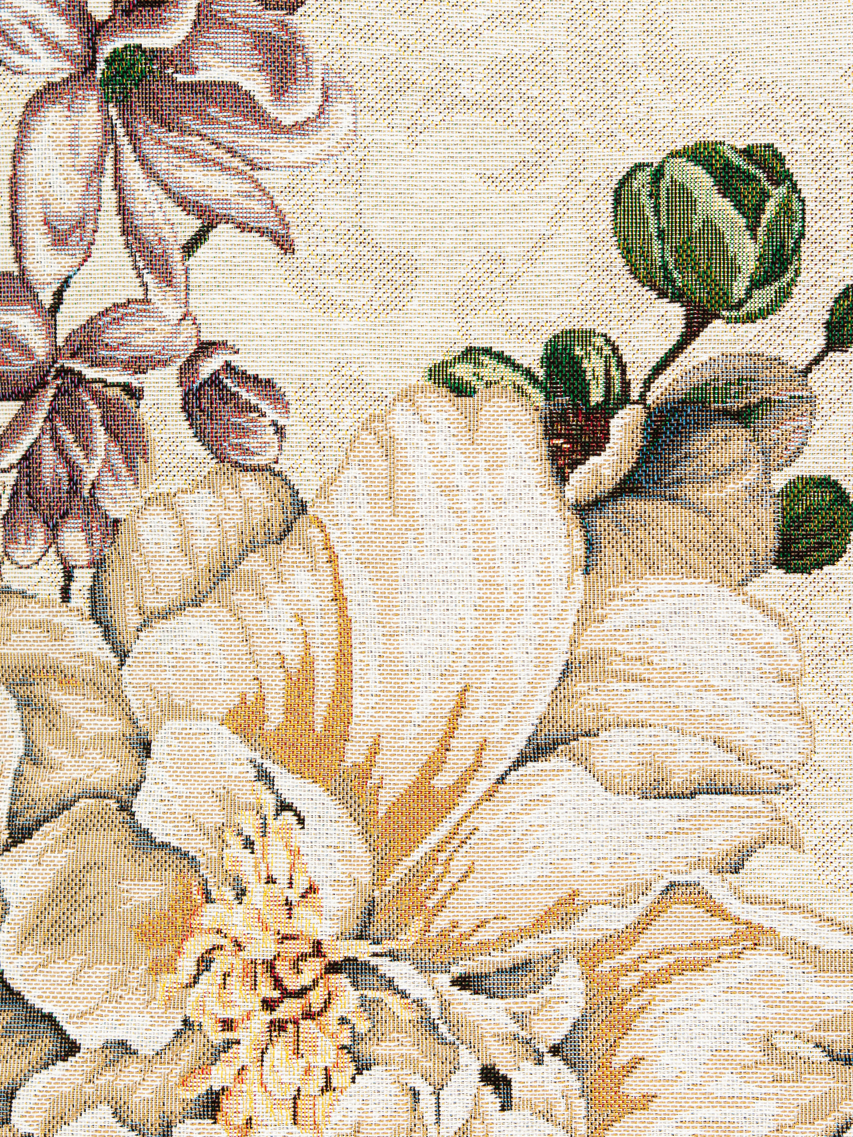Рисунок создается переплетением нитей различных цветов и фактуры. Состав ткани: хлопок ( дающий фактуру и приятную тактильность ) и синтетические нити ( придающие износостойкость ). Плотность гобелена 410 г на кв.метр.