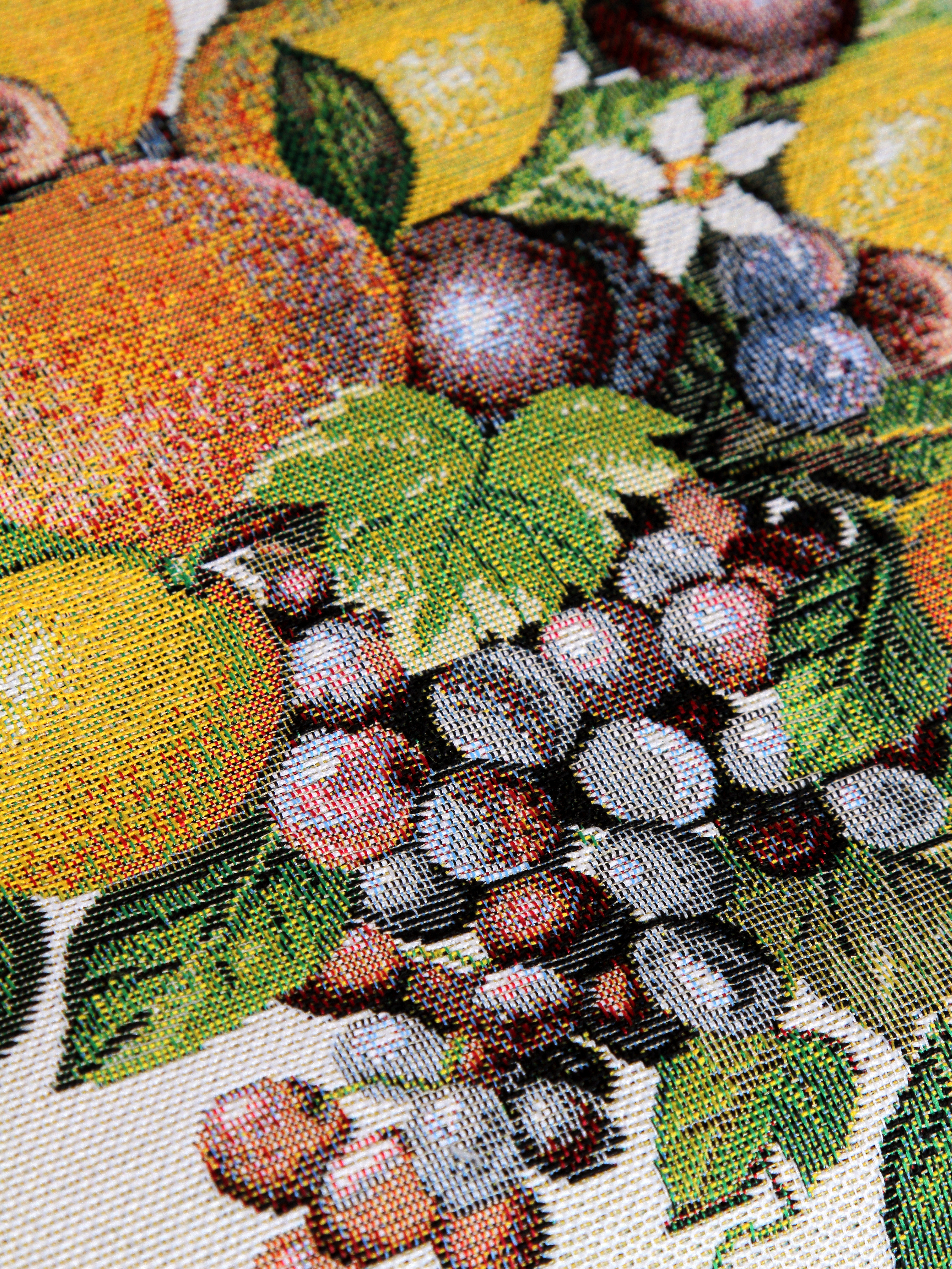 Рисунок создается переплетением нитей различных цветов и фактуры. Состав ткани: хлопок ( дающий фактуру и приятную тактильность ) и синтетические нити ( придающие износостойкость ). Плотность гобелена 410 г на кв.метр.