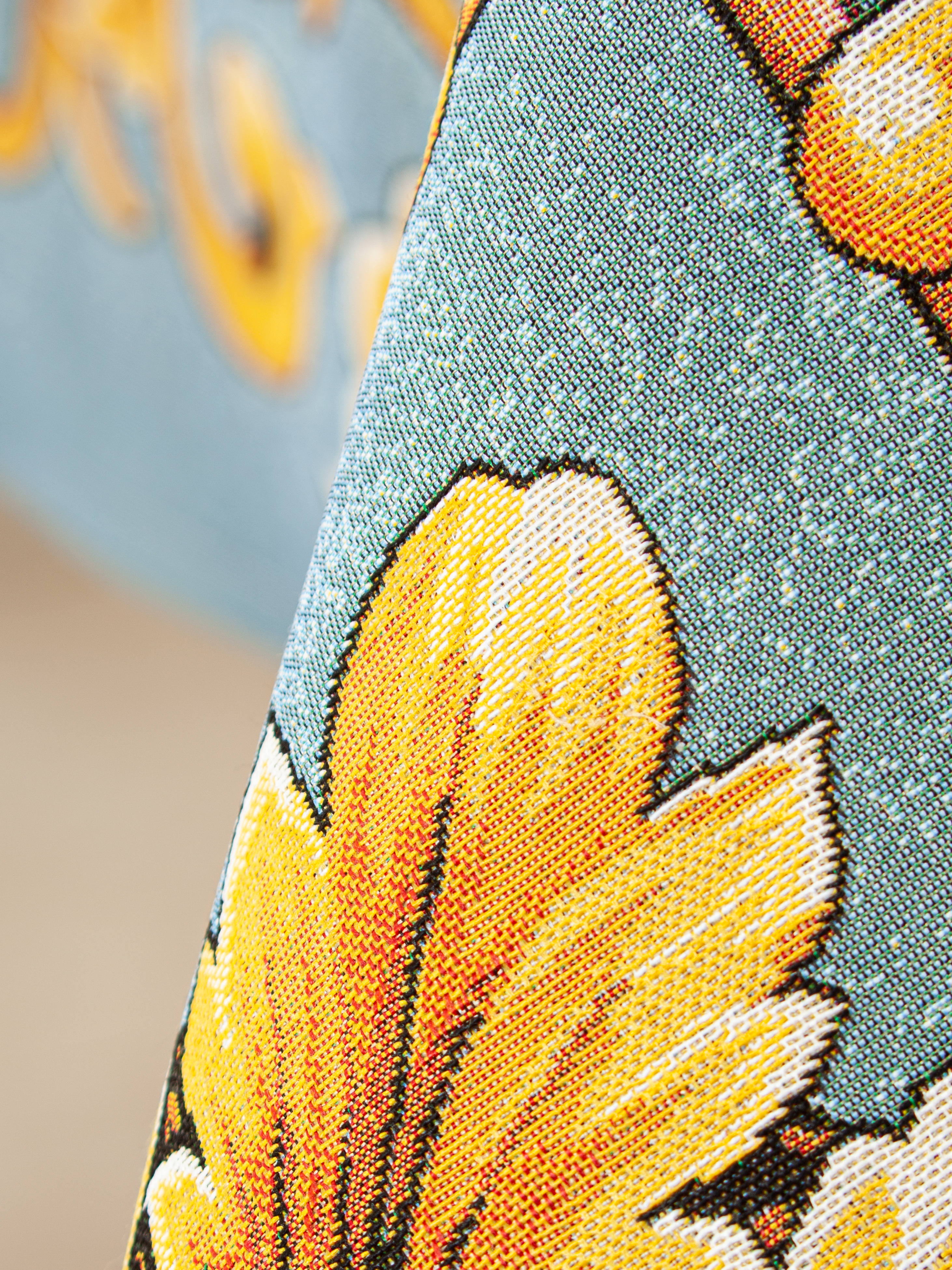 Рисунок создается переплетением нитей различных цветов и фактуры. Состав ткани: хлопок ( дающий фактуру и приятную тактильность ) и синтетические нити ( придающие износостойкость ). Плотность гобелена 410 г на кв.метр.