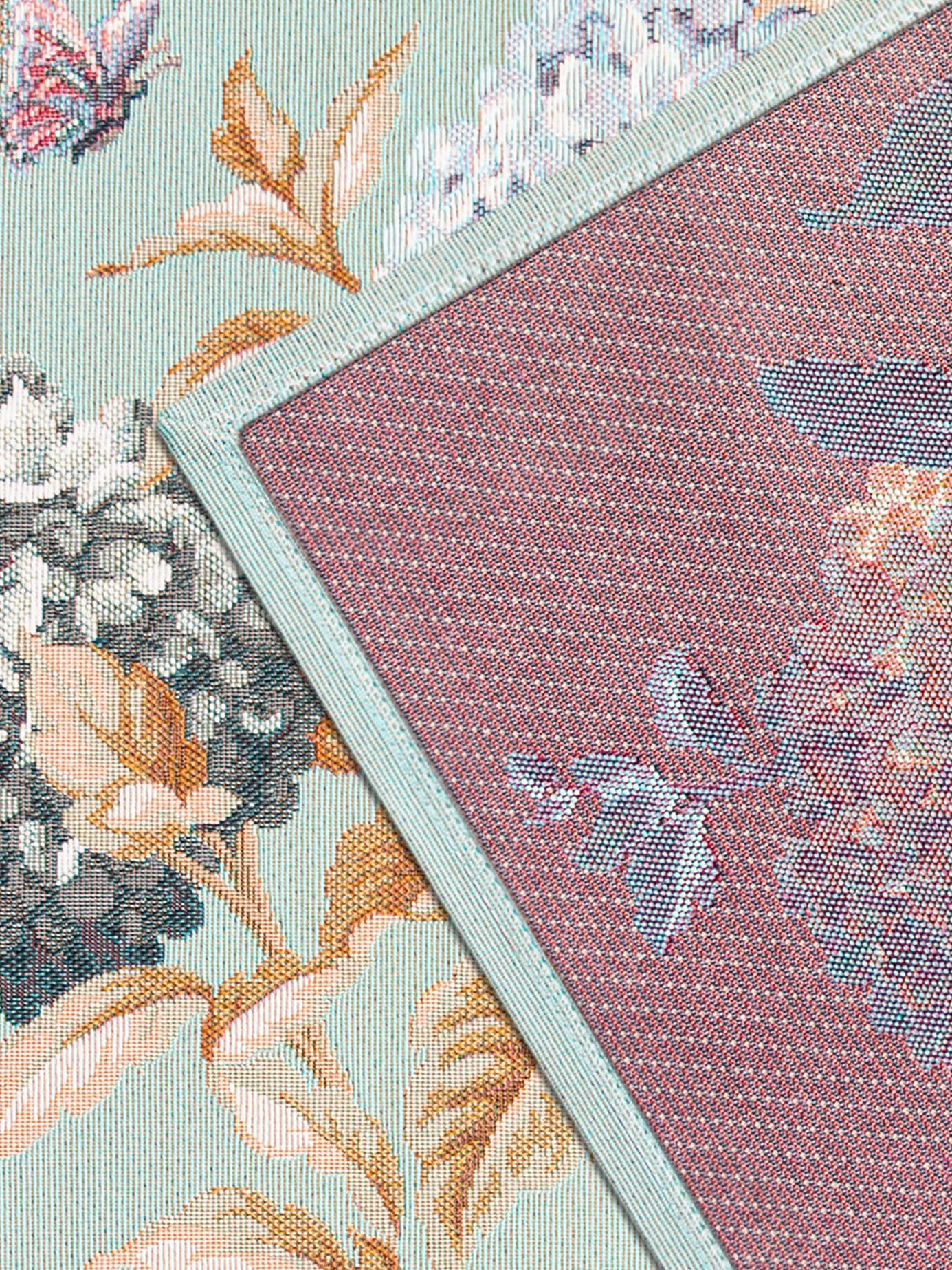 Рисунок создается переплетением нитей различных цветов и фактуры. Состав ткани: хлопок ( дающий фактуру и приятную тактильность ) и синтетические нити ( придающие износостойкость ). Плотность гобелена 410 г на кв.метр.
