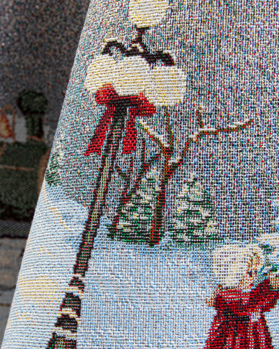 Рисунок создается переплетением нитей различных цветов и фактуры. Состав ткани: хлопок ( дающий фактуру и приятную тактильность ) и синтетические нити ( придающие износостойкость ). Плотность гобелена 410 г на кв.метр.