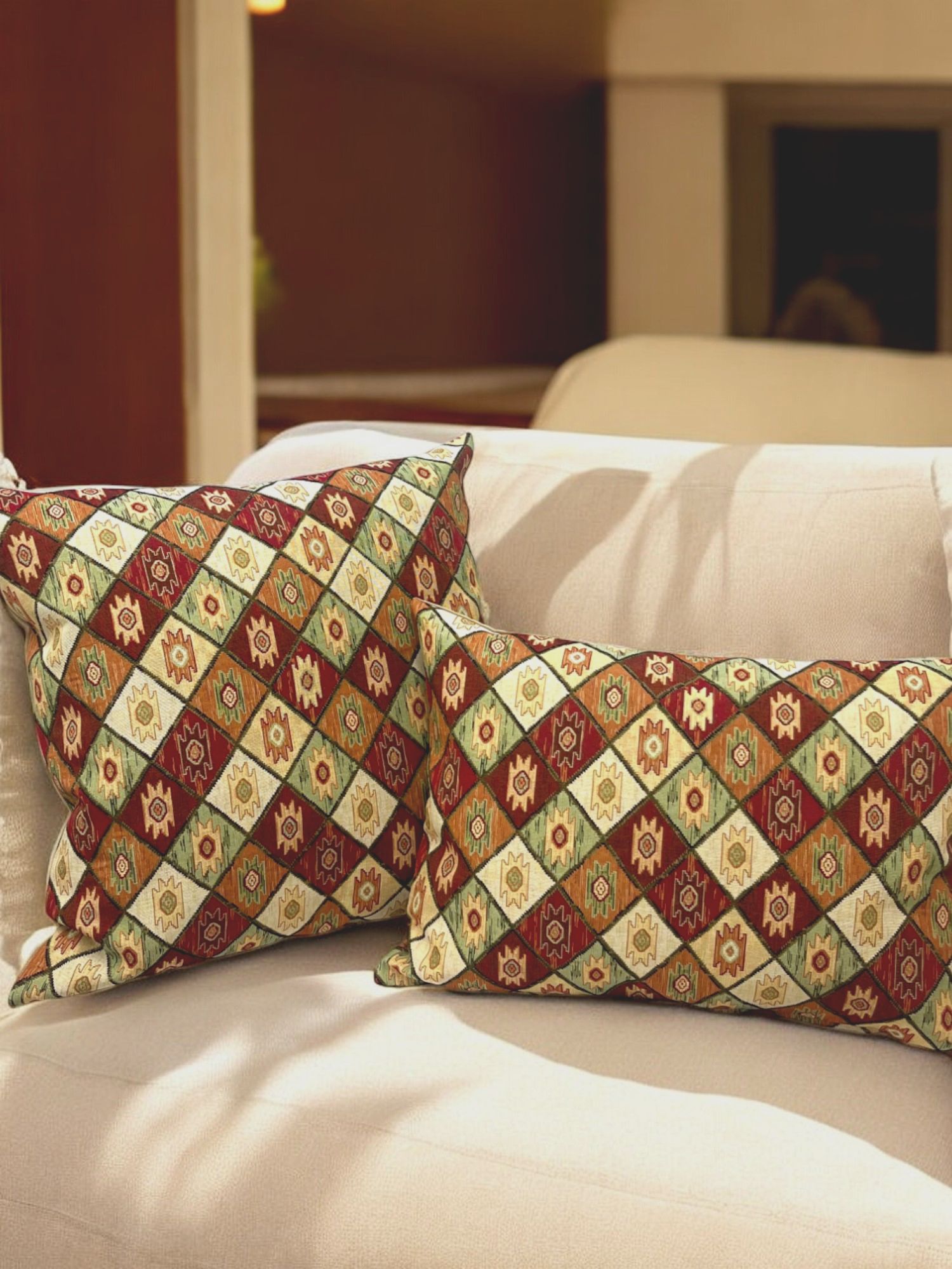 Рисунок создается переплетением нитей различных цветов и фактуры. Состав ткани: хлопок ( дающий фактуру и приятную тактильность ) и синтетические нити ( придающие износостойкость ). Плотность гобелена 410 г на кв.метр.