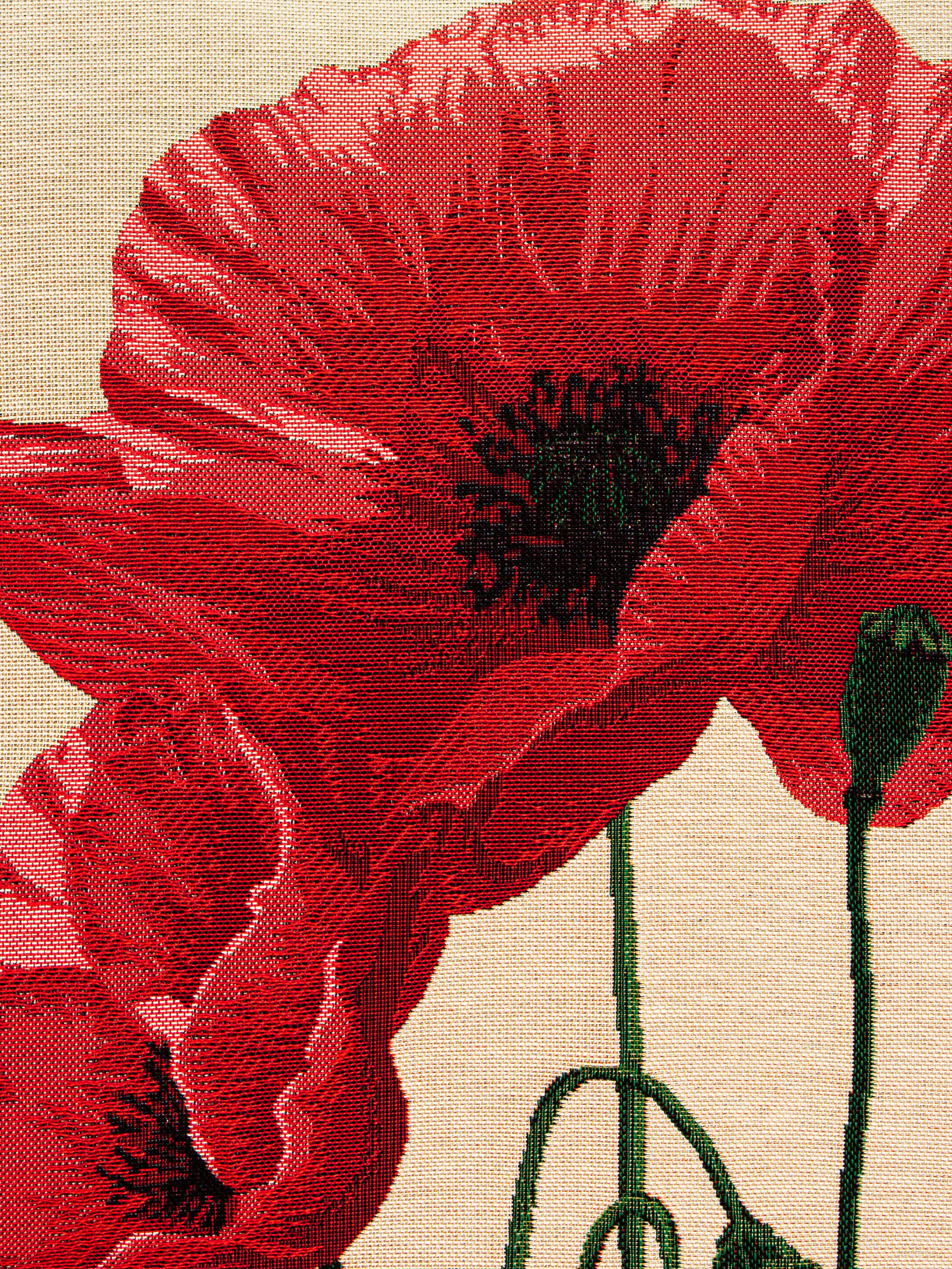 Рисунок создается переплетением нитей различных цветов и фактуры. Состав ткани: хлопок ( дающий фактуру и приятную тактильность ) и синтетические нити ( придающие износостойкость ). Плотность гобелена 410 г на кв.метр.
