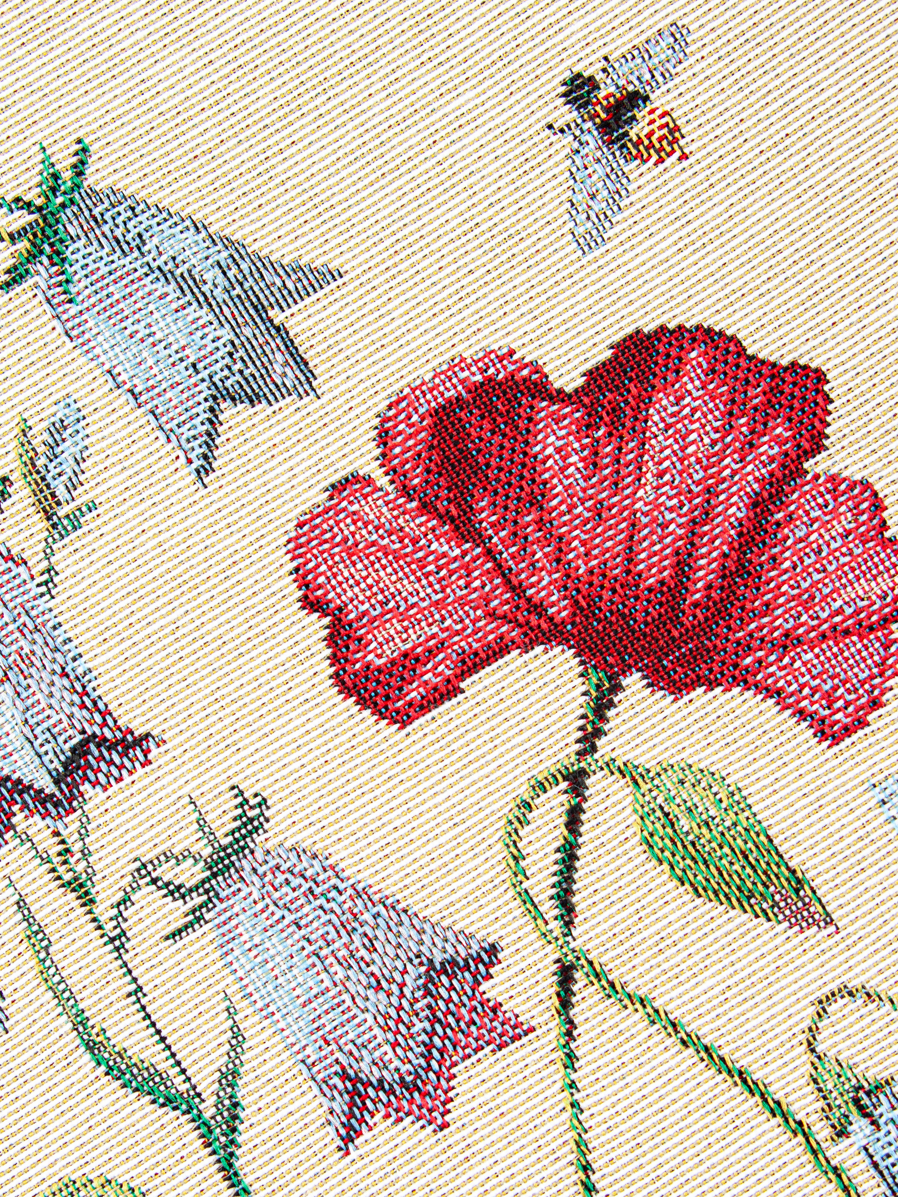 Рисунок создается переплетением нитей различных цветов и фактуры. Состав ткани: хлопок ( дающий фактуру и приятную тактильность ) и синтетические нити ( придающие износостойкость ). Плотность гобелена 410 г на кв.метр.