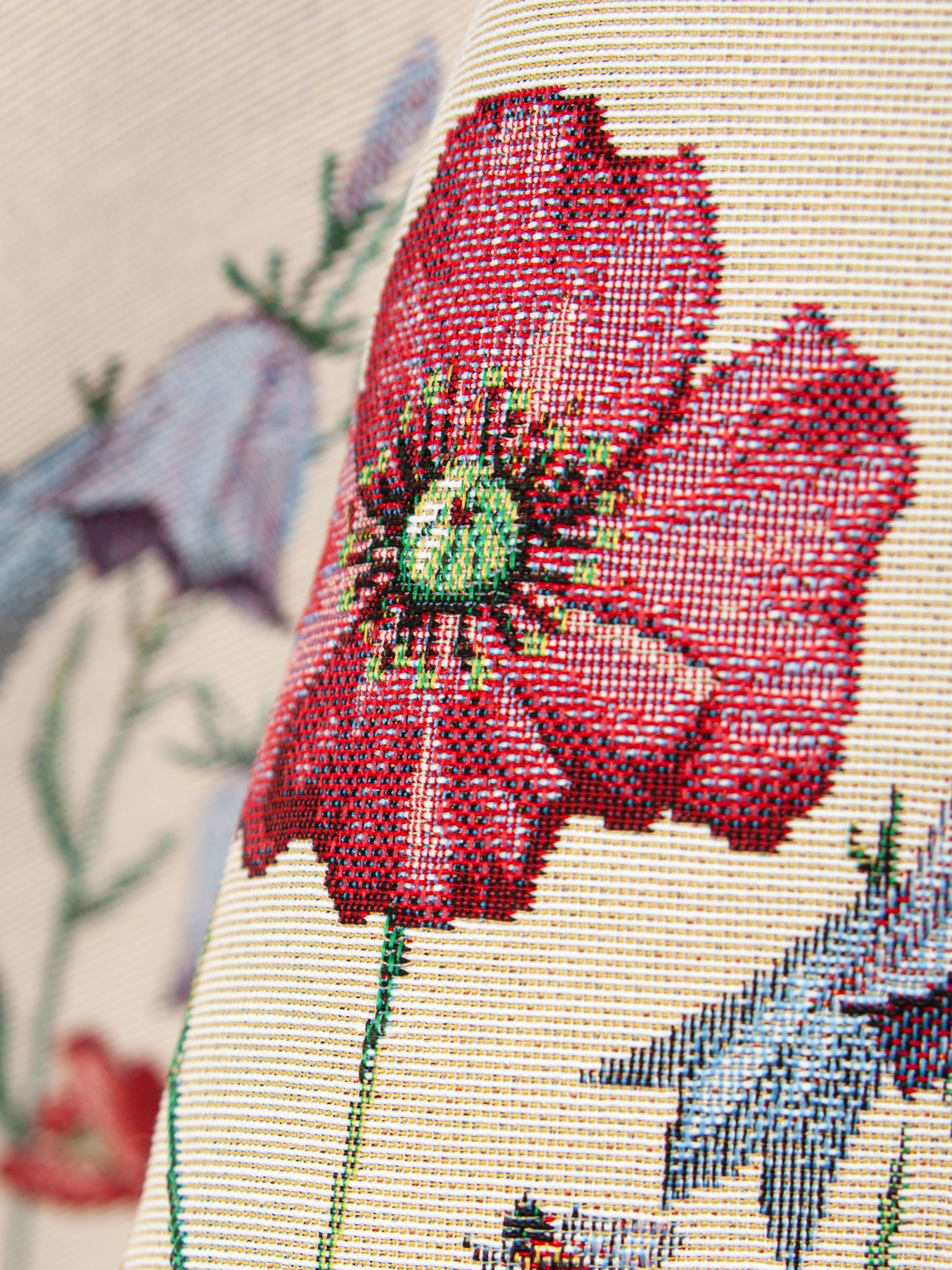 Рисунок создается переплетением нитей различных цветов и фактуры. Состав ткани: хлопок ( дающий фактуру и приятную тактильность ) и синтетические нити ( придающие износостойкость ). Плотность гобелена 410 г на кв.метр.