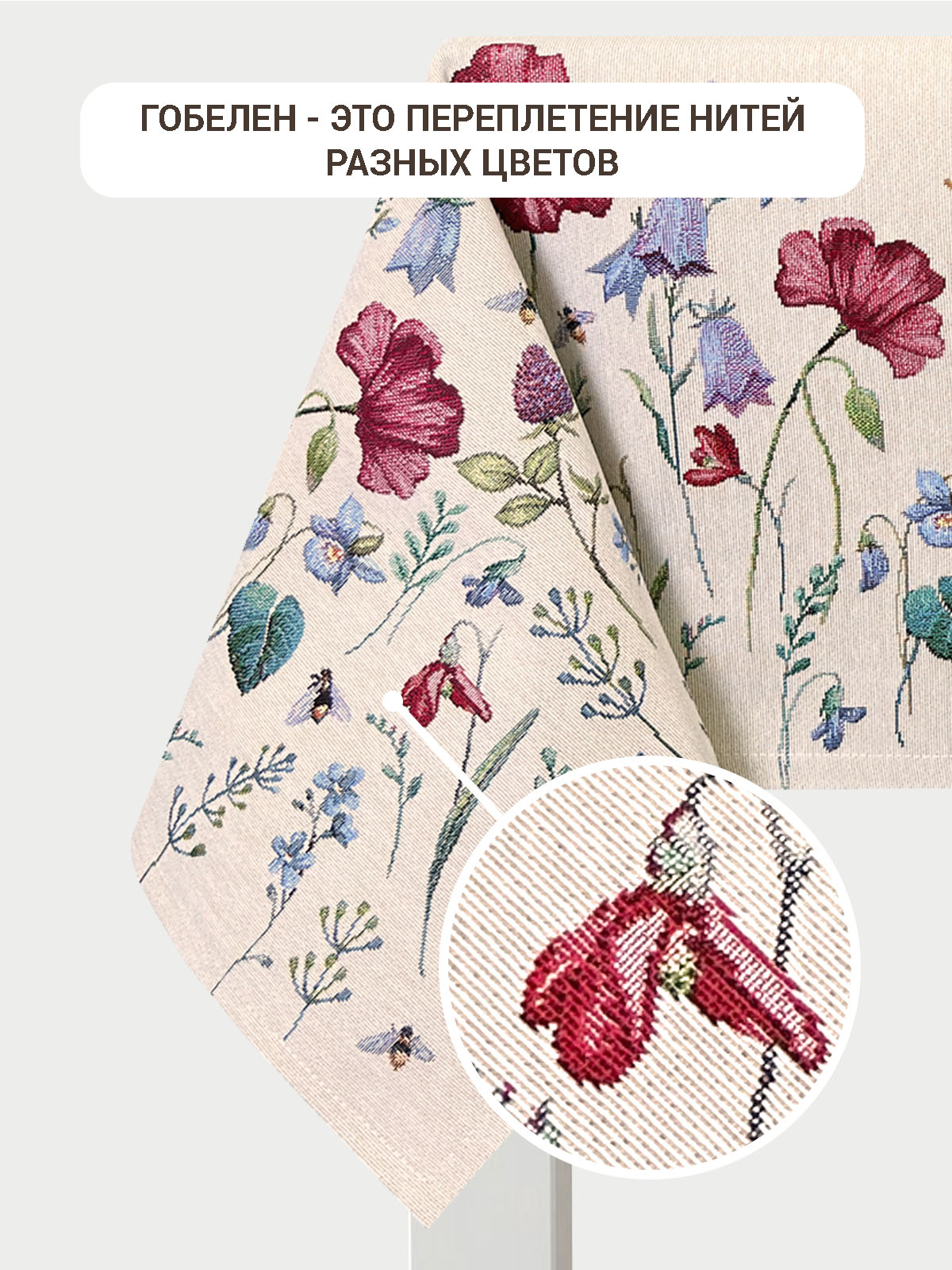 Рисунок создается переплетением нитей различных цветов и фактуры. Состав ткани: хлопок ( дающий фактуру и приятную тактильность ) и синтетические нити ( придающие износостойкость ). Плотность гобелена 410 г на кв.метр.