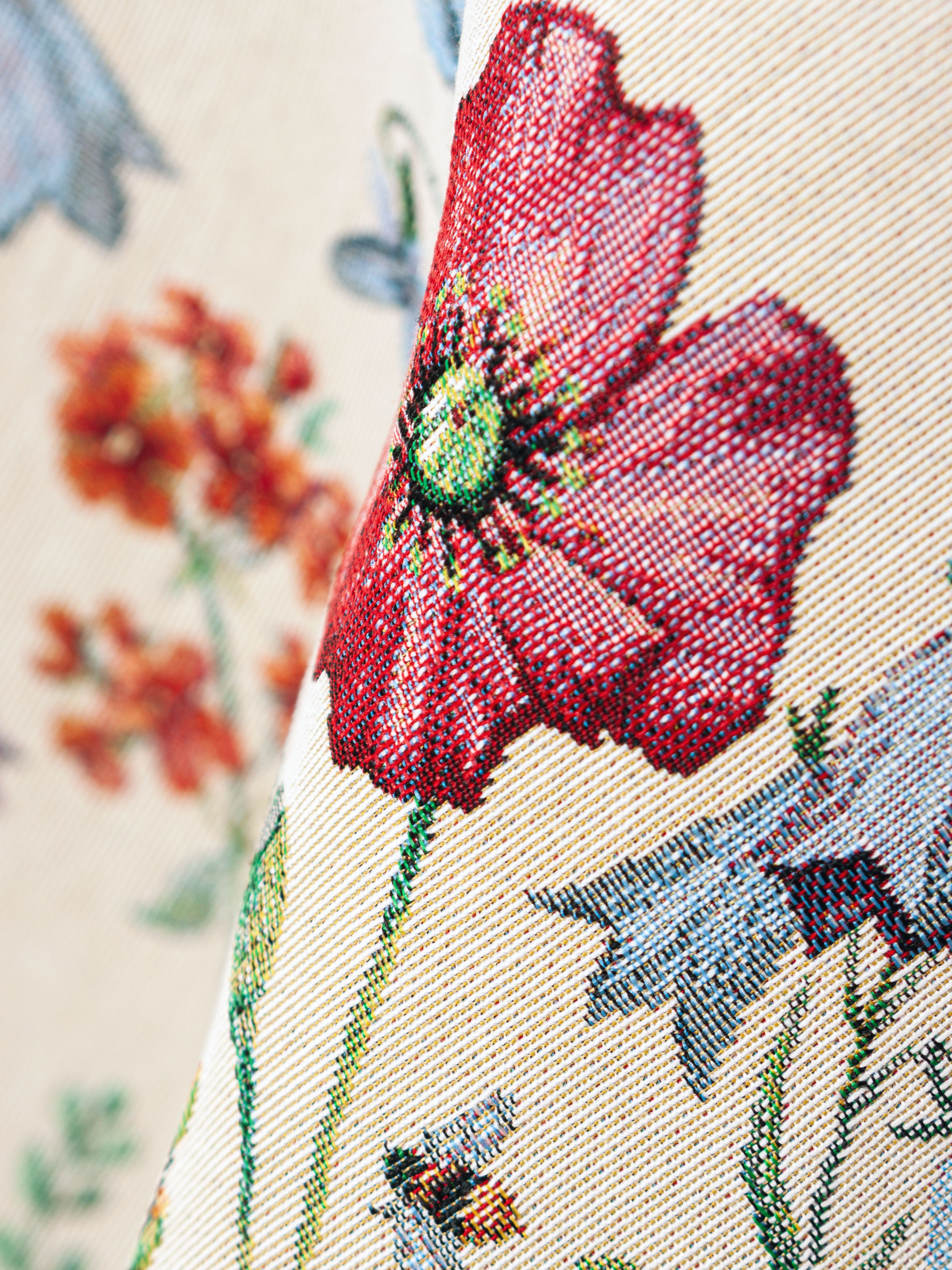 Рисунок создается переплетением нитей различных цветов и фактуры. Состав ткани: хлопок ( дающий фактуру и приятную тактильность ) и синтетические нити ( придающие износостойкость ). Плотность гобелена 410 г на кв.метр.