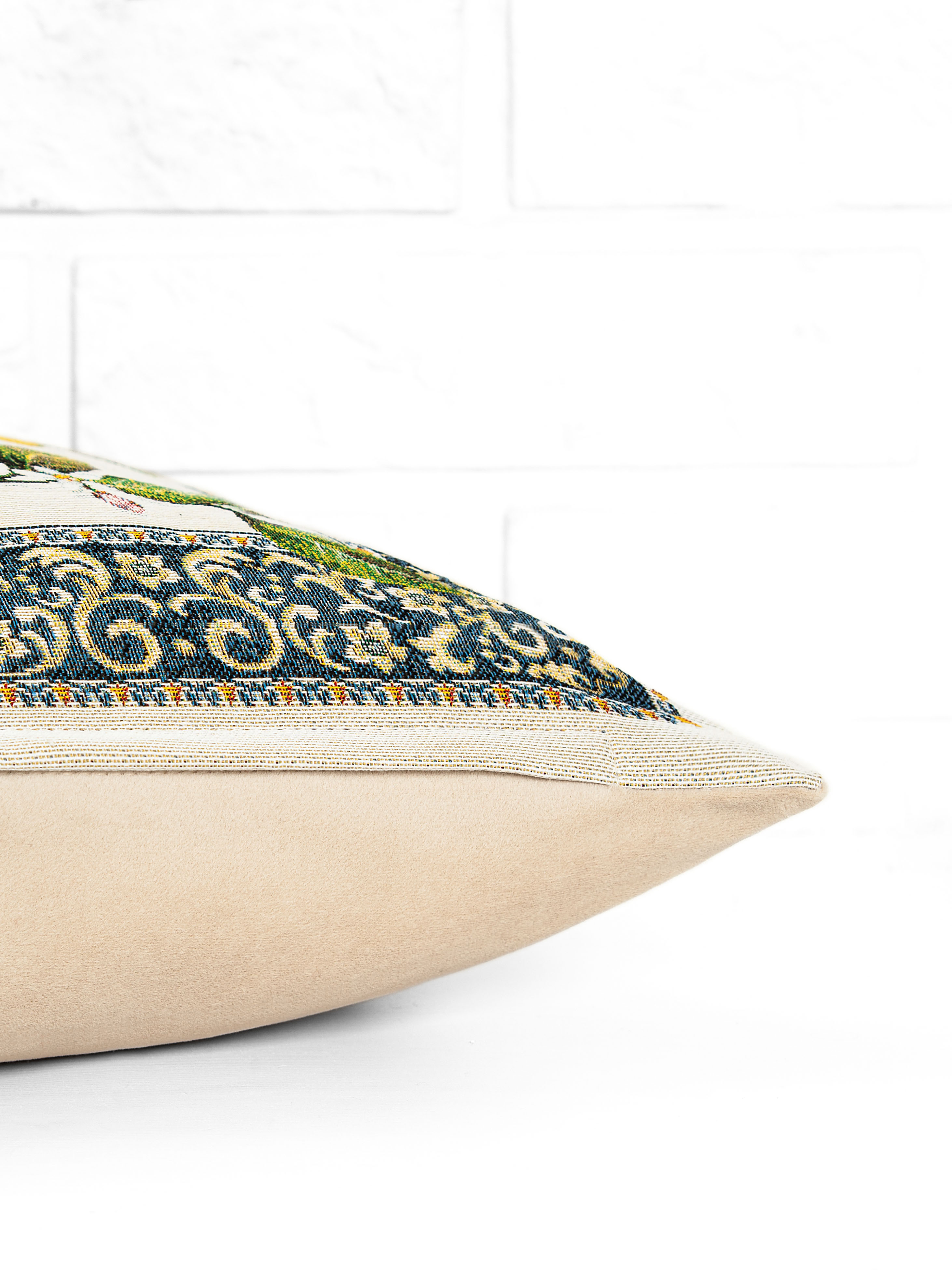 Рисунок создается переплетением нитей различных цветов и фактуры. Состав ткани: хлопок ( дающий фактуру и приятную тактильность ) и синтетические нити ( придающие износостойкость ). Плотность гобелена 410 г на кв.метр.