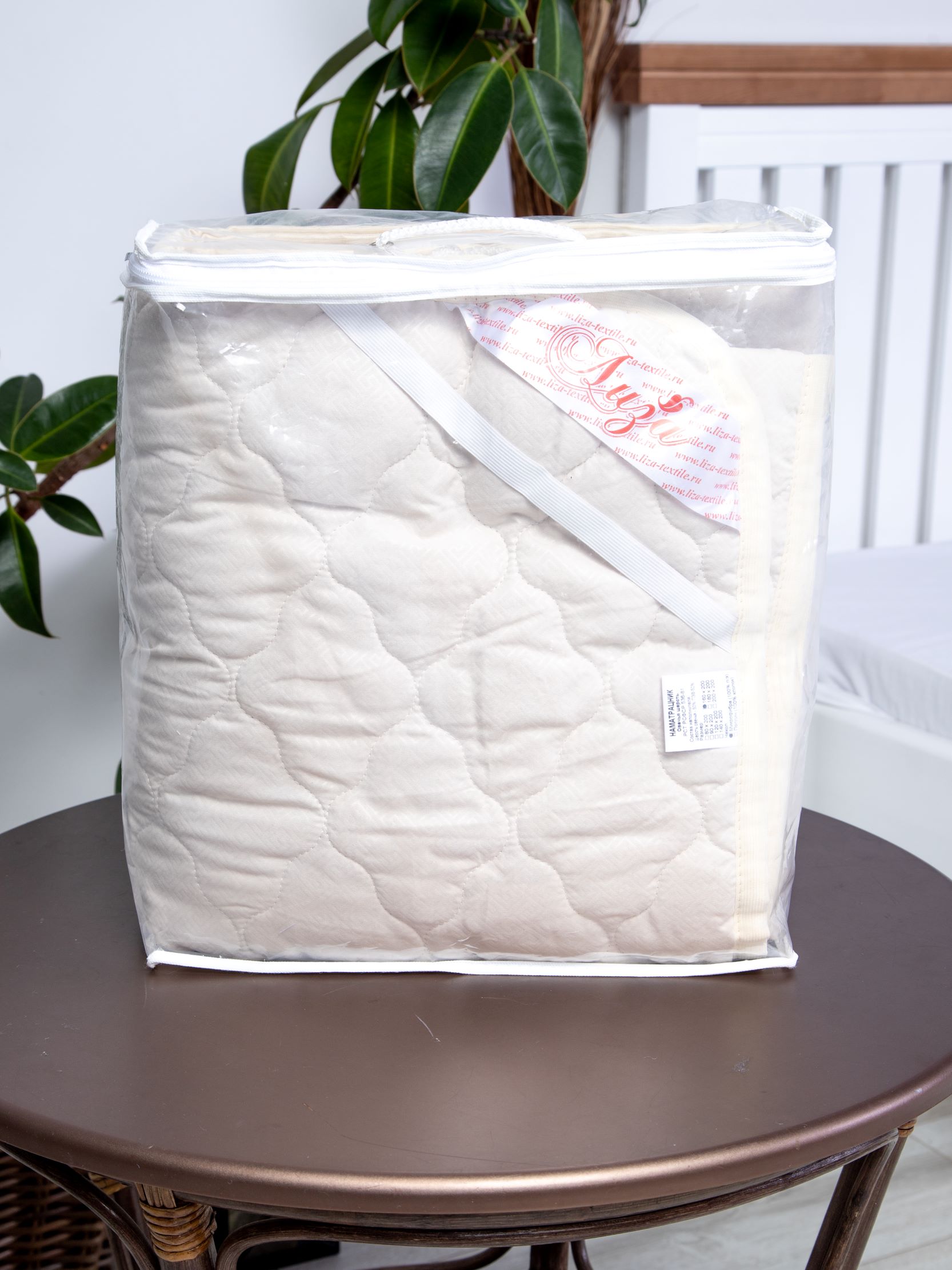 Наматрасник с наполнением из овечьей шерсти плотностью 150 гр/кв.м., окантован широкой тесьмой, по углам - резинка для фиксации на матрасе. Многоигольная стежка исключает смещение наполнителя внутри изделия, чехол устойчив к механическим воздействиям. Упаковка - тубус ПВХ с ручкой.