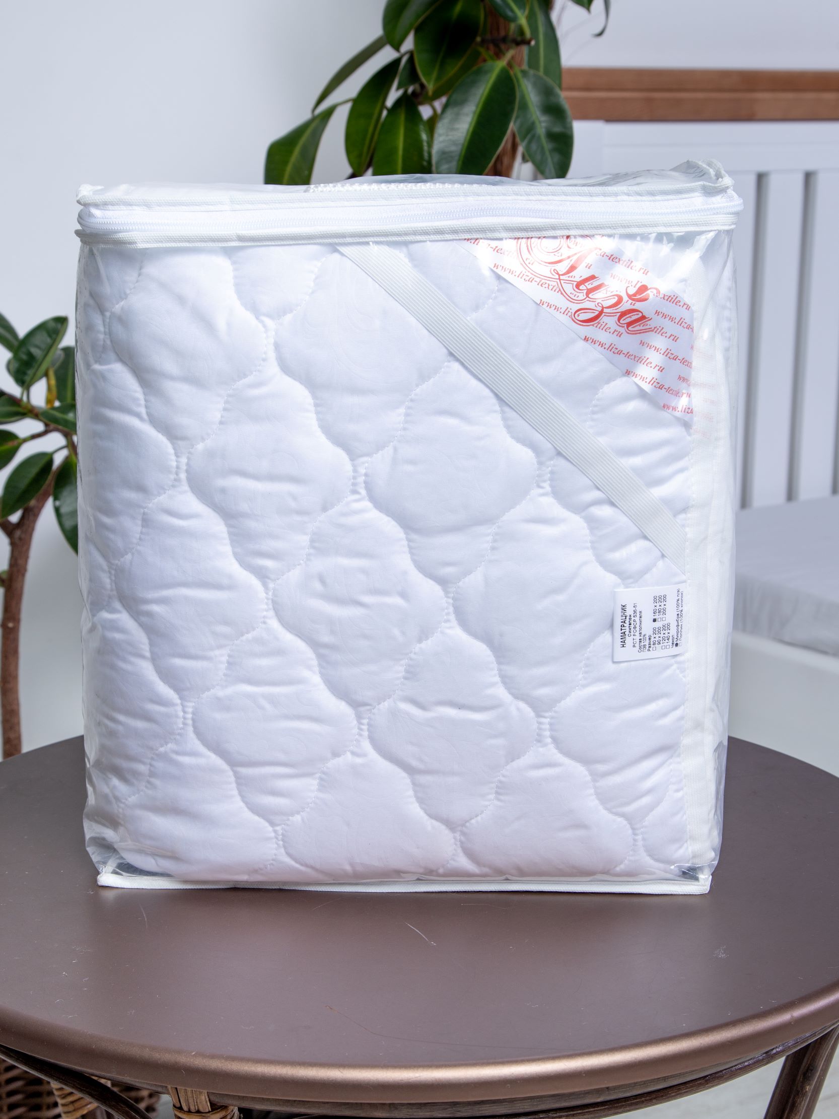 Наматрасник с наполнением из синтепона плотностью 150 гр/кв.м., окантован широкой тесьмой, по углам - резинка для фиксации на матрасе. Многоигольная стежка исключает смещение наполнителя внутри изделия, чехол устойчив к механическим воздействиям. Упаковка - тубус ПВХ с ручкой.