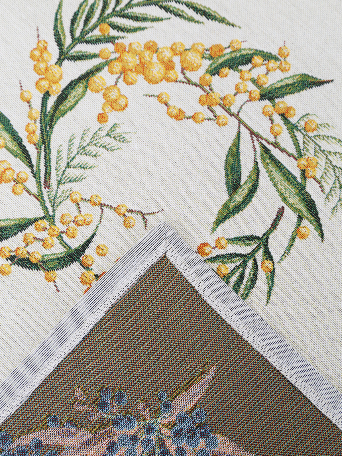 Рисунок создается переплетением нитей различных цветов и фактуры. Состав ткани: хлопок ( дающий фактуру и приятную тактильность ) и синтетические нити ( придающие износостойкость ). Плотность гобелена 410 г на кв.метр.