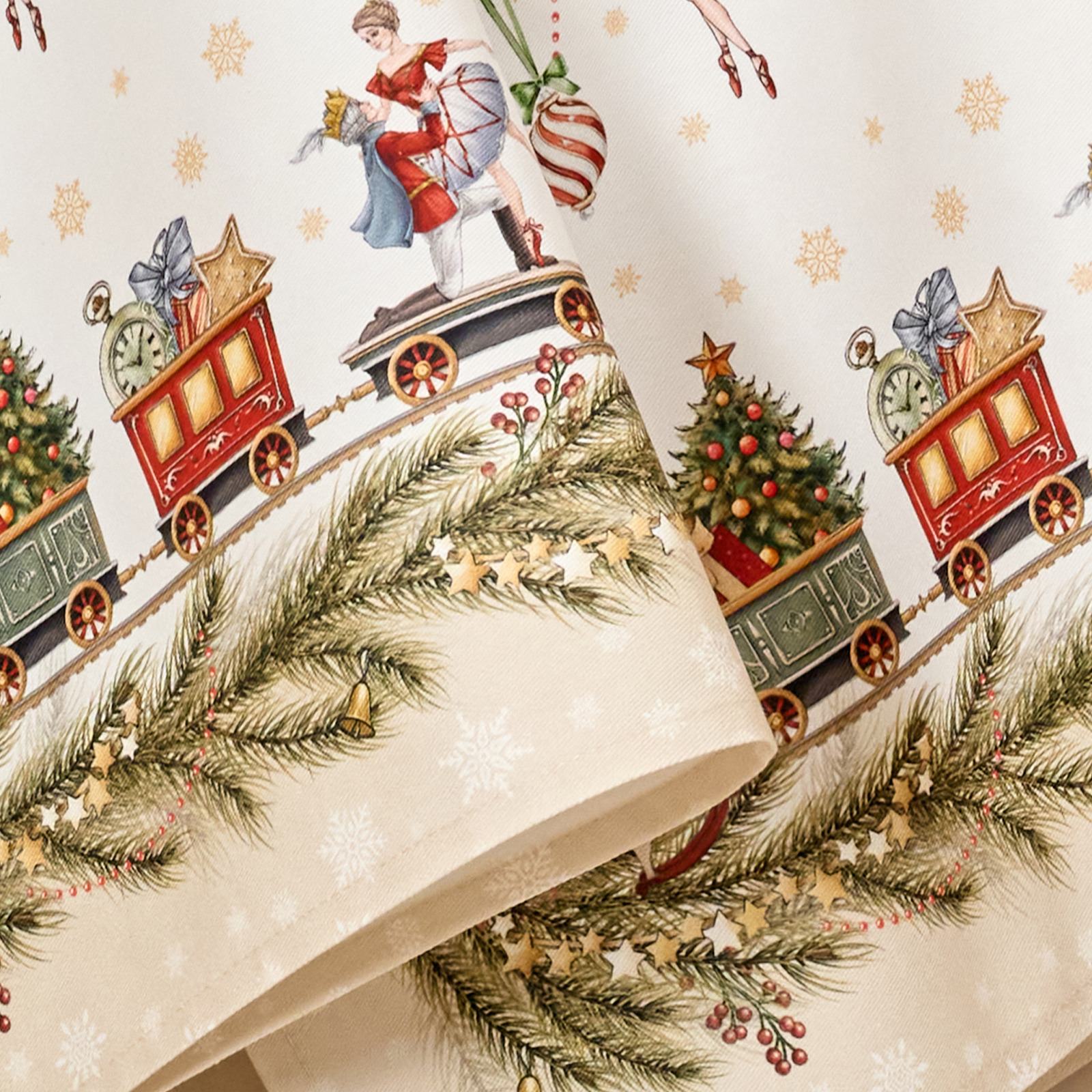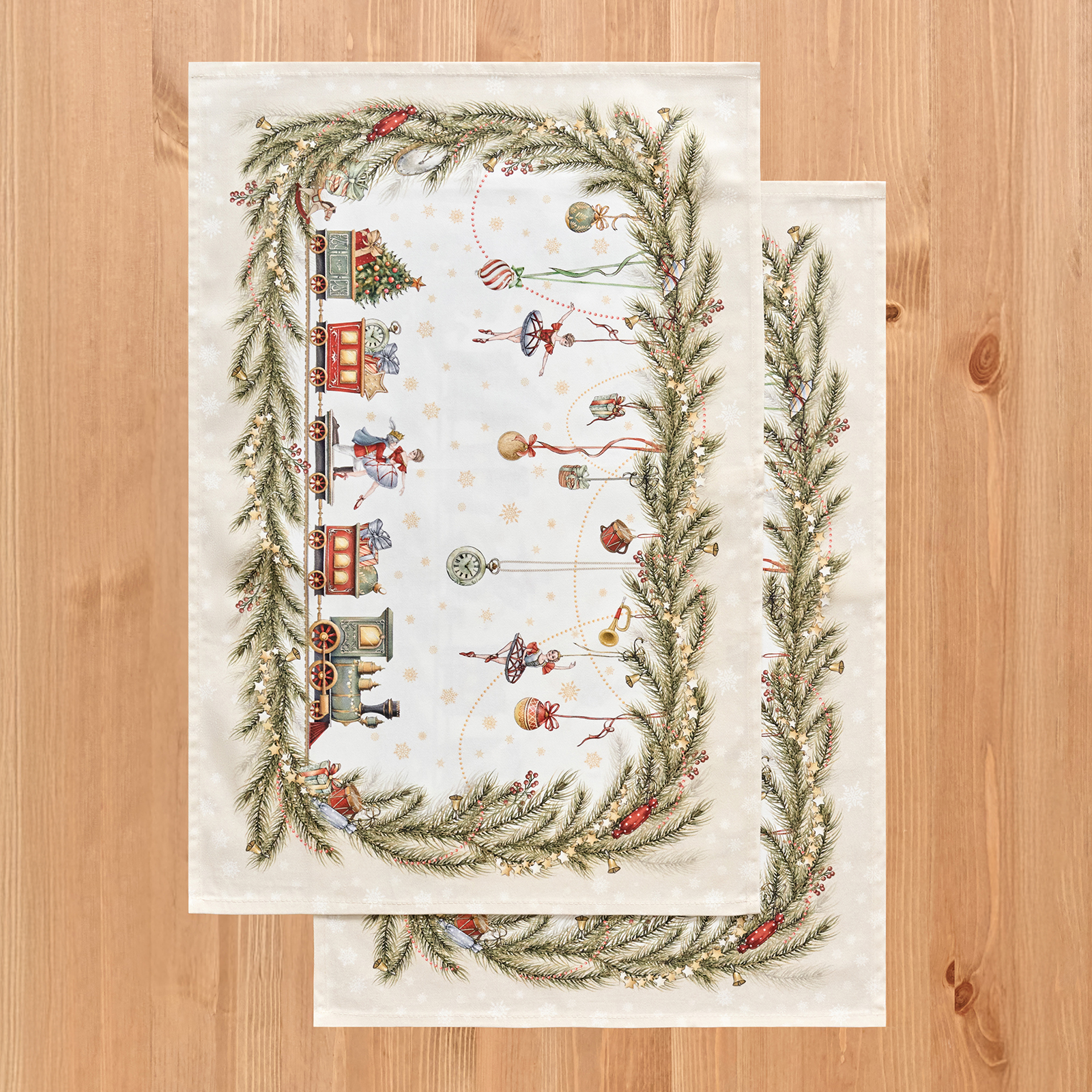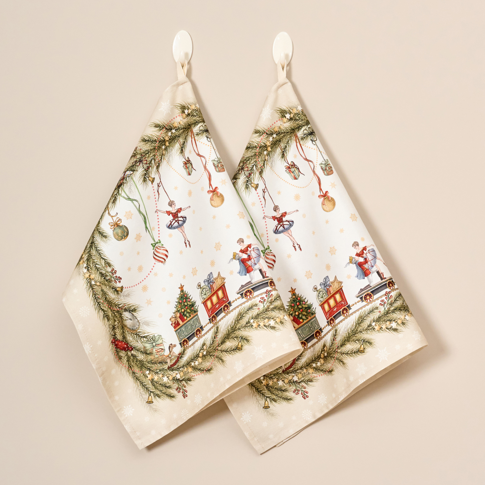 Рисунок нанесён методом современной цифровой печати, что обеспечивает чёткость линий и стойкость цвета даже после многократных стирок. Белый фон и насыщенные оттенки делают полотенца выразительным элементом новогоднего декора.