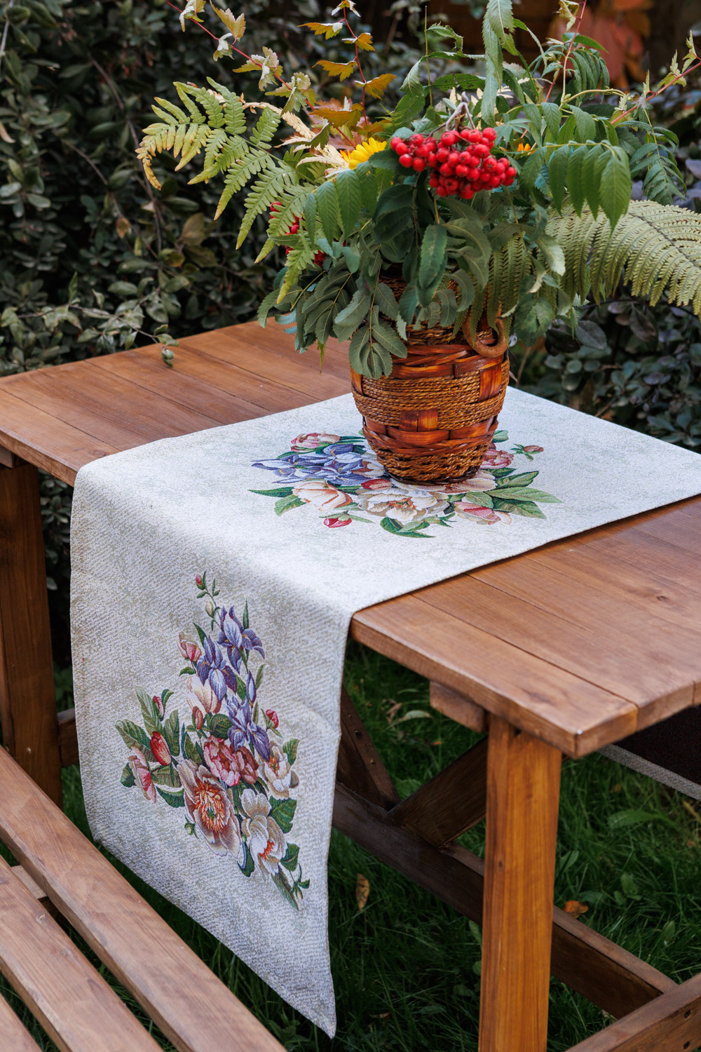 Рисунок создается переплетением нитей различных цветов и фактуры. Состав ткани: хлопок ( дающий фактуру и приятную тактильность ) и синтетические нити ( придающие износостойкость ). Плотность гобелена 410 г на кв.метр.