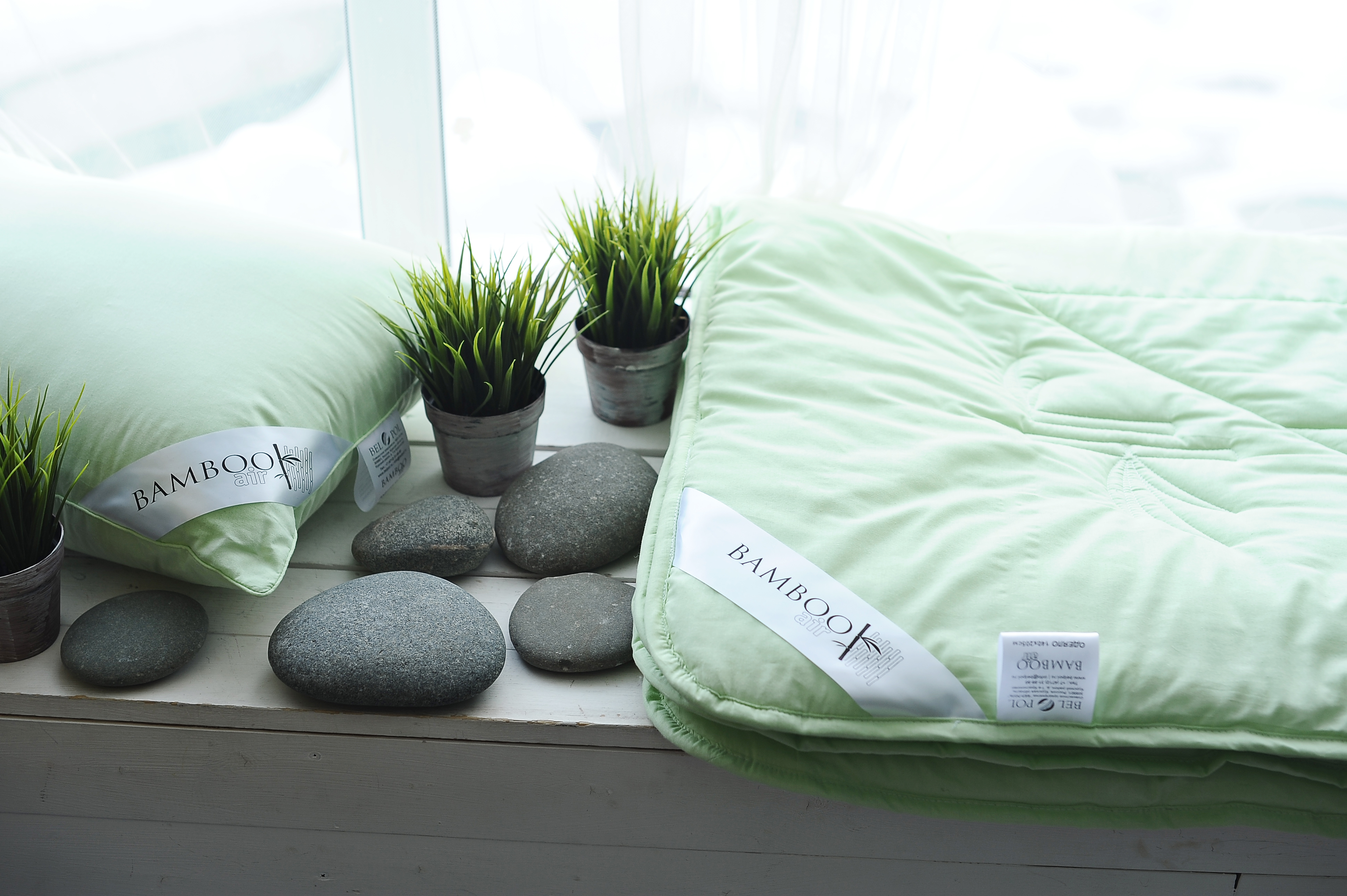 Бамбуковое волокно — это волокно вискозного типа, основным преимуществом которого являются его антимикробные свойства. Ткань чехла — сатин, хлопок 100%. В подушке термополотно «Бамбук», плотность 100 г/м2 под тканью верха, наполнитель — микроволокно «лебяжий пух». Эта конструкция позволяет обеспечить изделию оптимальную упругость и природные свойства.