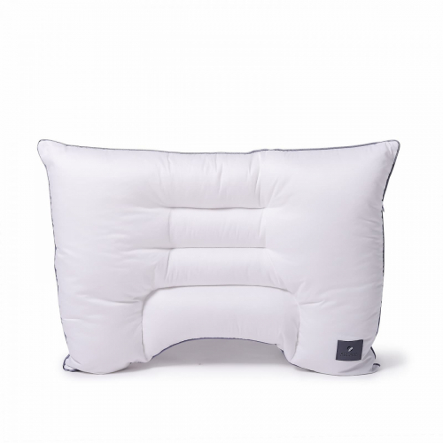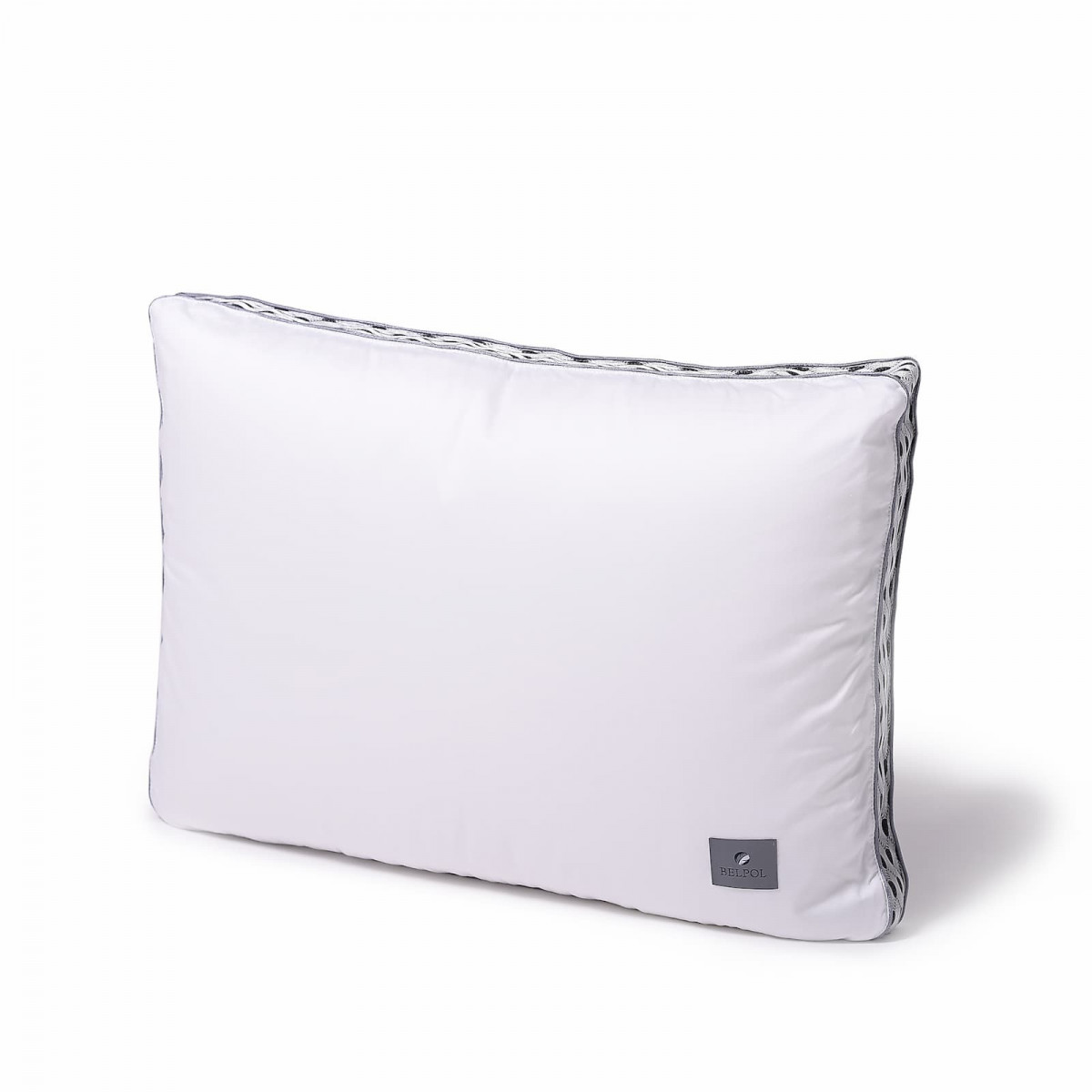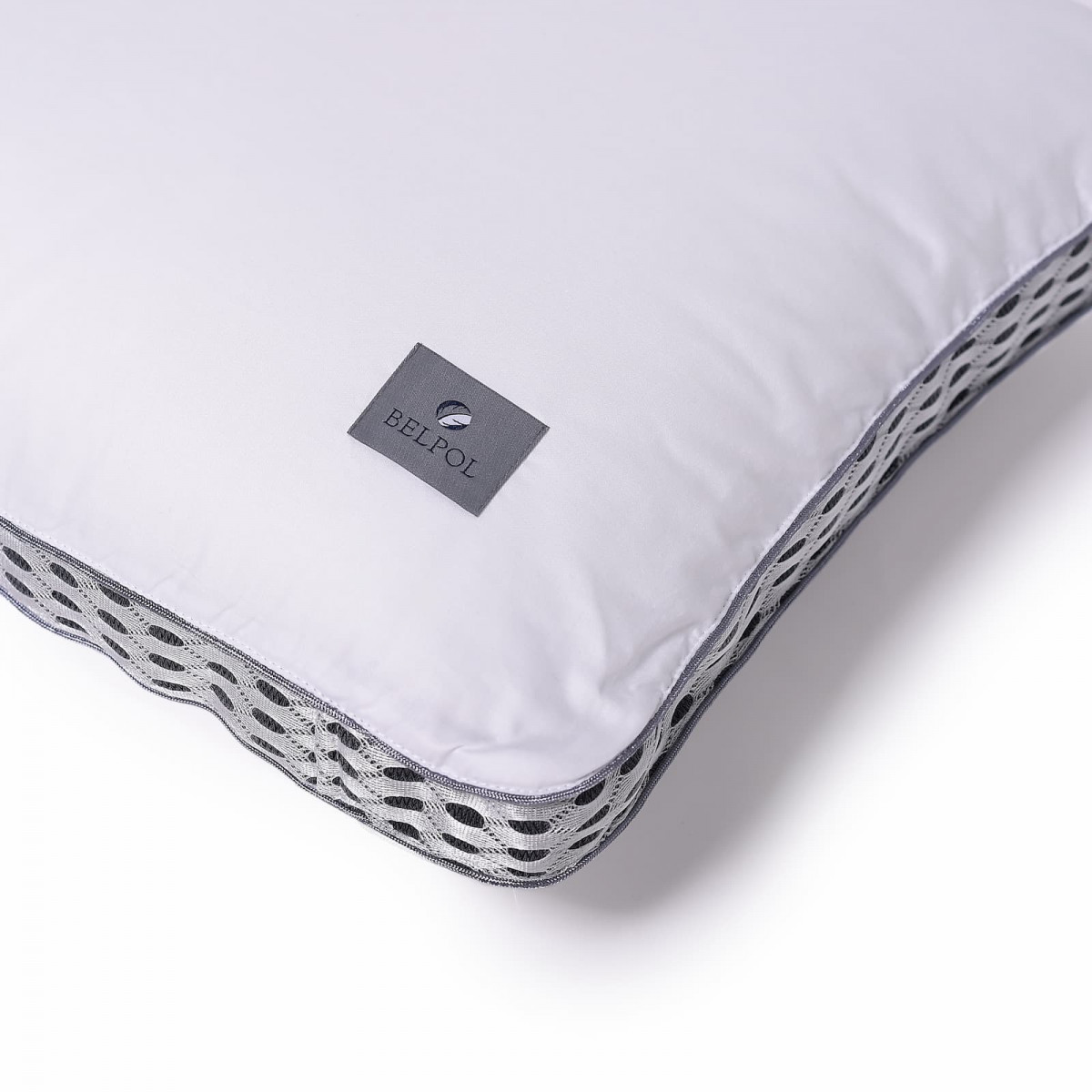 Подушка READY — высокая, плотная модель с белым сатиновым чехлом и дышащим бортиком из 3D-сетки для эффективного воздухообмена.