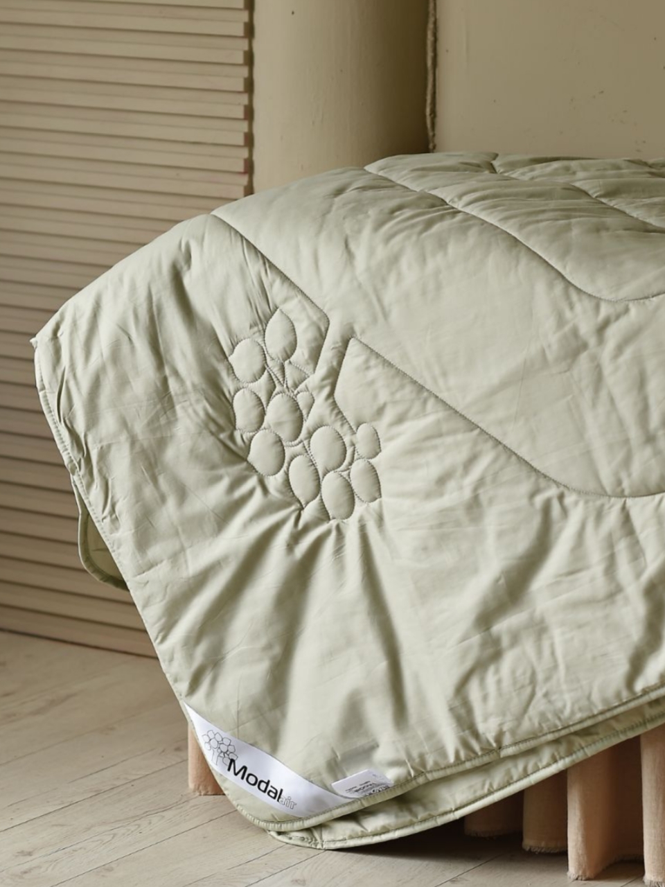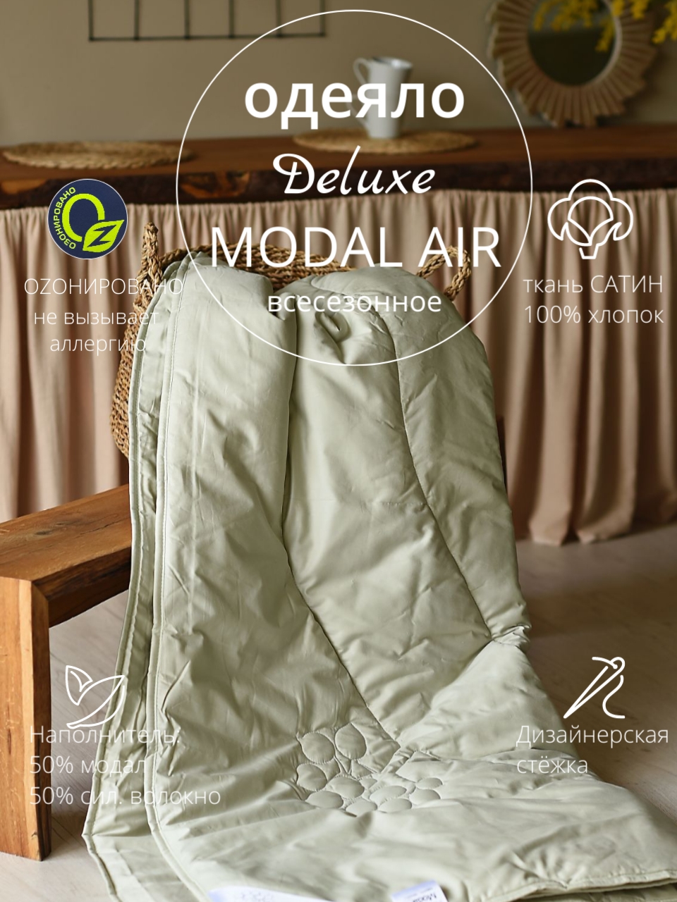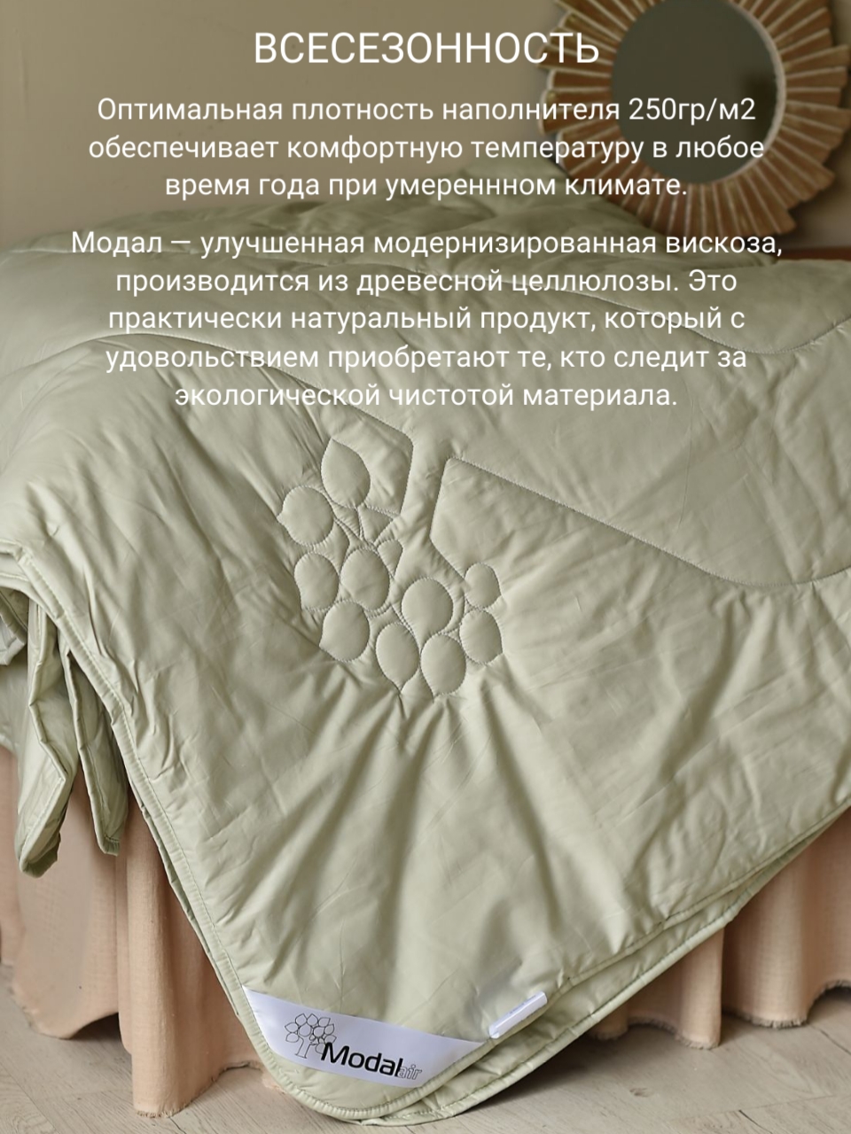 Модал — улучшенная модернизированная вискоза, производится из древесной целлюлозы. Это практически натуральный продукт, который с удовольствием приобретают те, кто следит за экологической чистотой материала. Наполнитель одеяла — термополотно с модалом, плотностью 250 г/м2. Подходит для создания умеренного теплового режима.