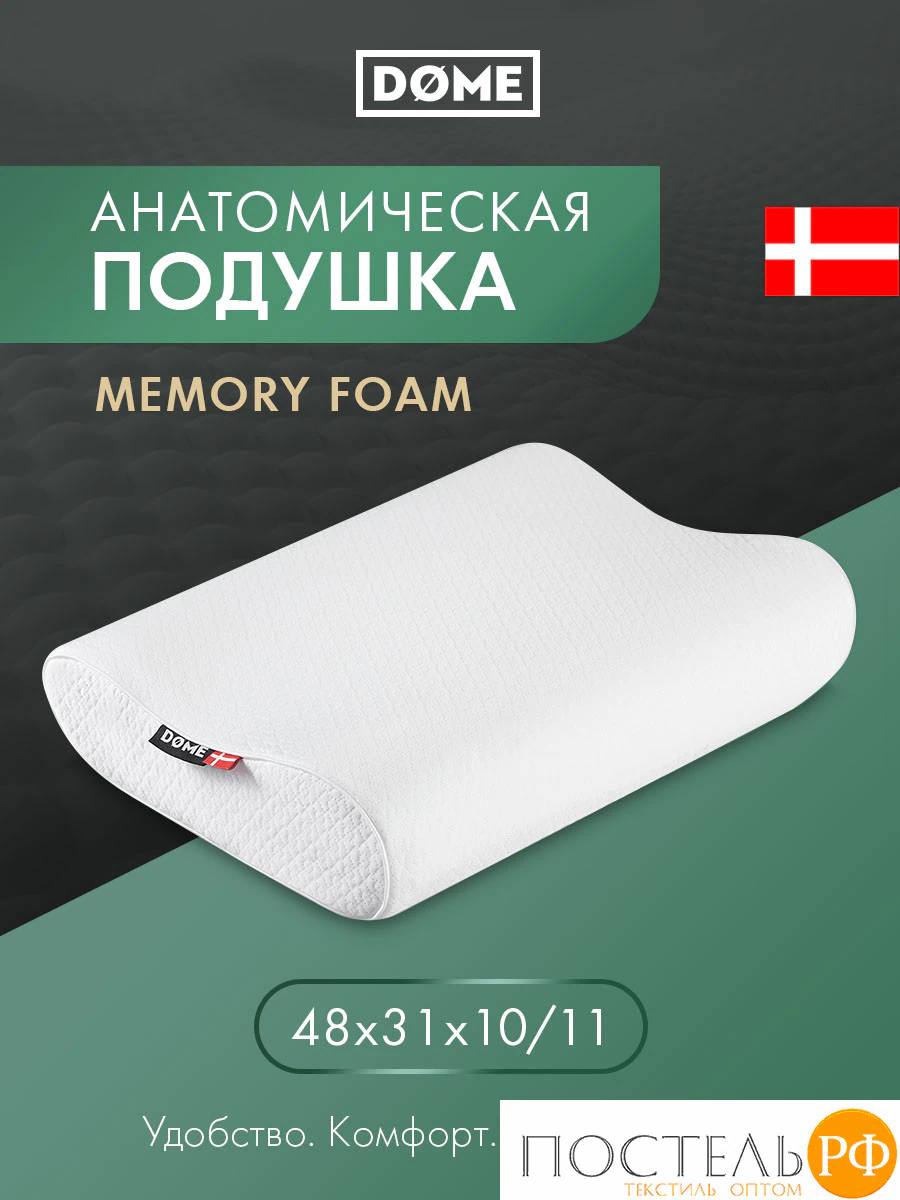 Подушка анатомическая 48х31х10/11: вязкоэластичный пенополиуретан с эффектом памяти Memory Foam. Несъемный внутренний чехол: 100% хлопок; съемный внешний чехол: 100% полиэстер.