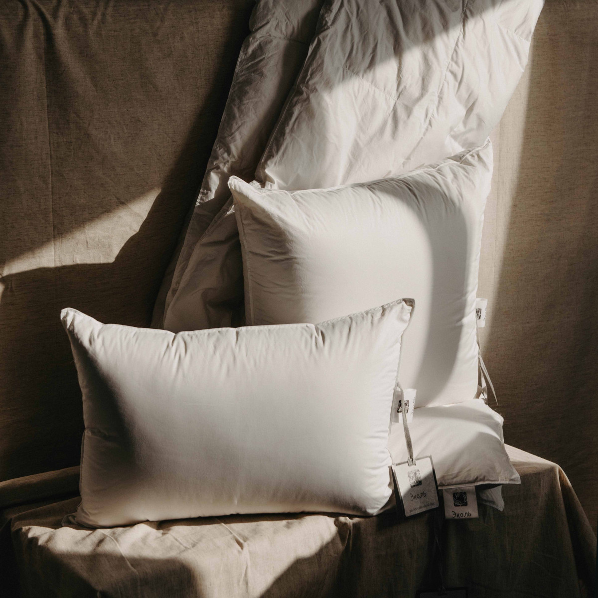 Сочетание лёгкого пуха и мягкой ткани создаёт уникальное тактильное ощущение, как будто голова «плывёт» в облаке пуха.