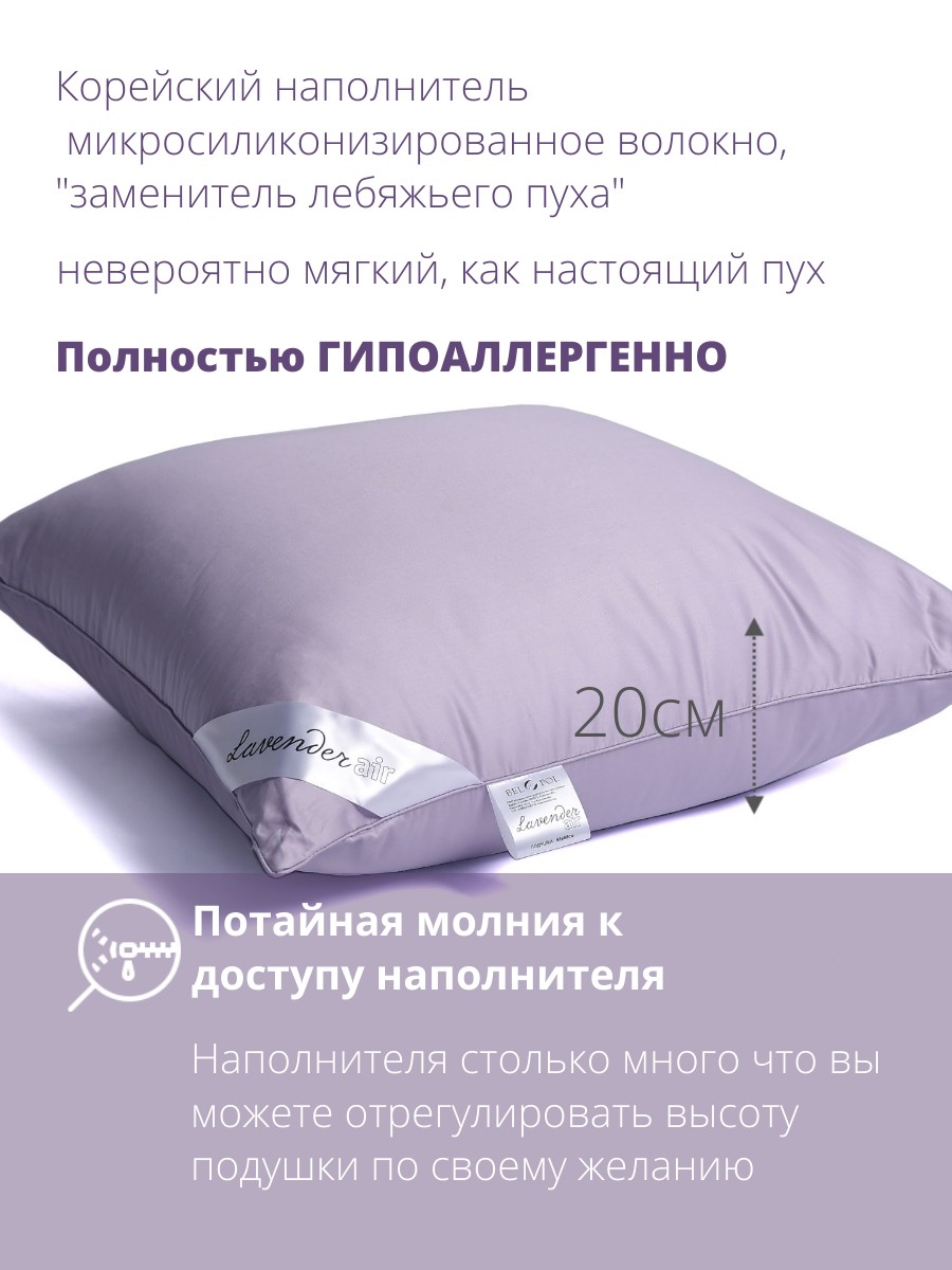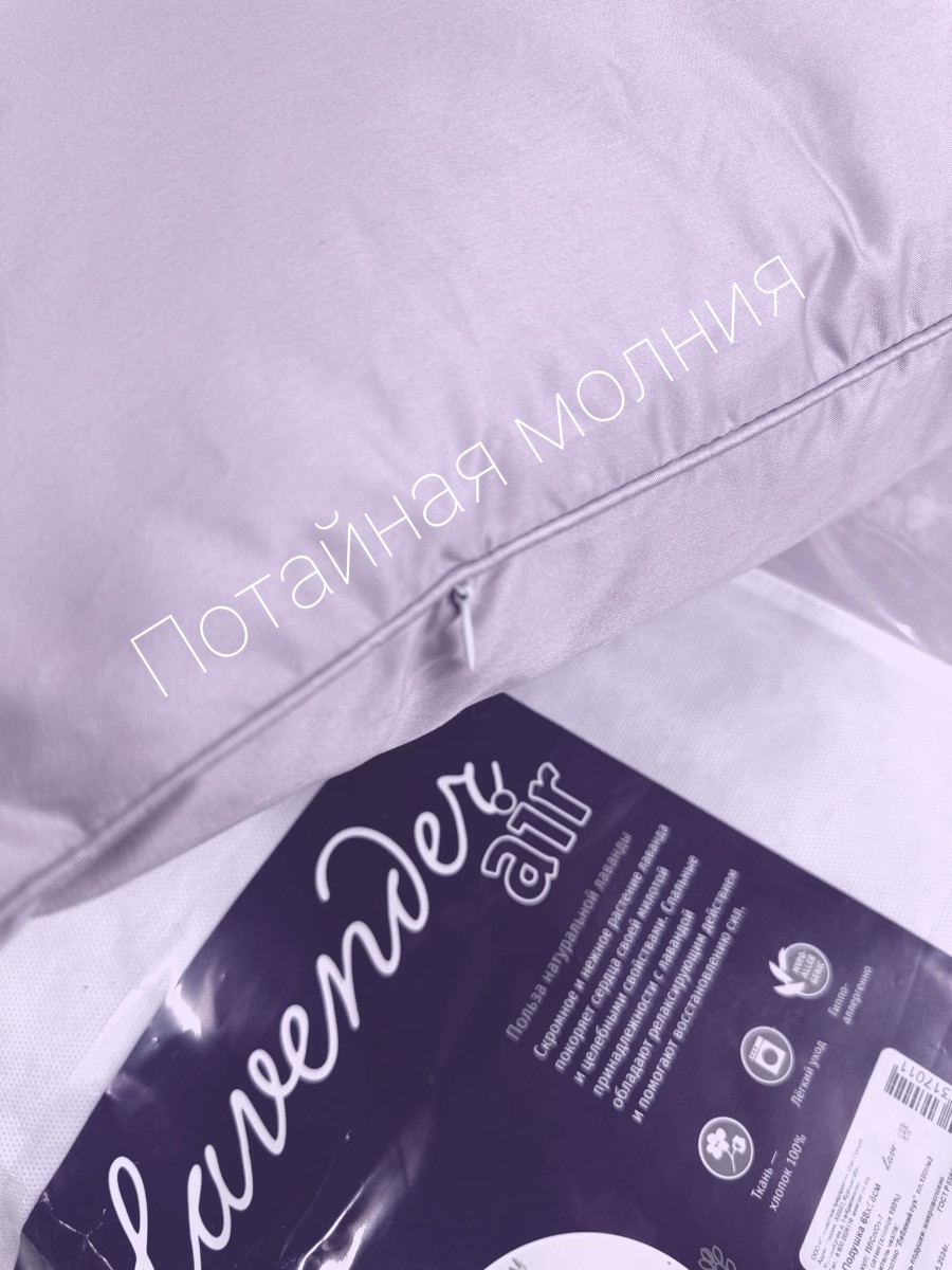 Подушка со средней поддержкой - анатомически правильная позиция головы и шеи. С помощью молнии можно добавить/убрать наполнитель - микроволокно "Лебяжий пух" (ультрамягкое, словно пух, гипоаллергенное). Лавандовое термополотно ПОД чехлом - двойная доза спокойствия, так как волокна лаванды постоянно выделяют успокаивающие эфирные масла. Чехол - премиальный хлопковый сатин сиреневого цвета в тон лаванды, мягчайший, дышащий.